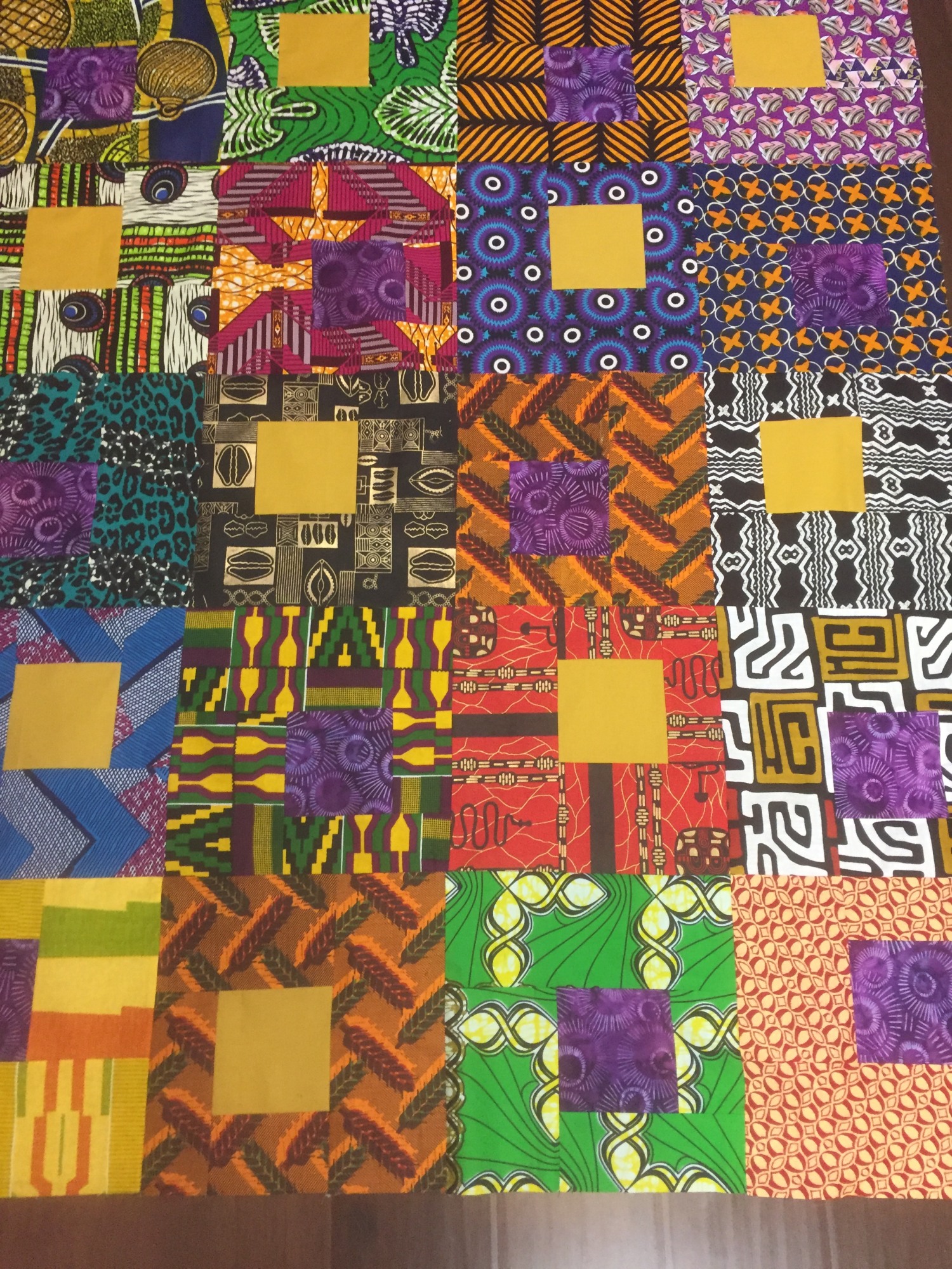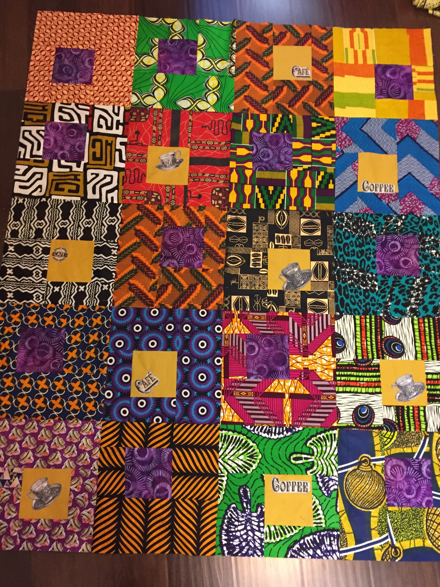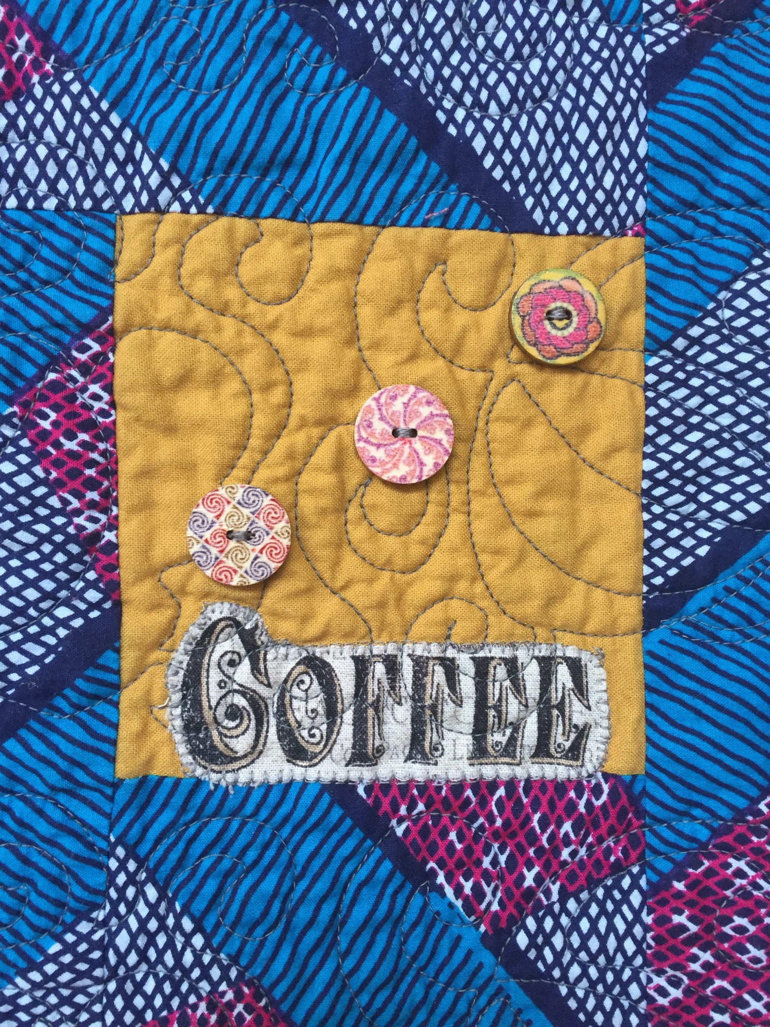 “Morning Coffee On My Patio” is a quilted wallhanging with a coffee theme. Coffee cups and words are appliquéd on the front of the quilt. The same coffee fabric is on the back of the quilt. However the vibrant African prints take center stage in the quilt, which measures 42 x 52 inches. Painted buttons add texture to the quilt.