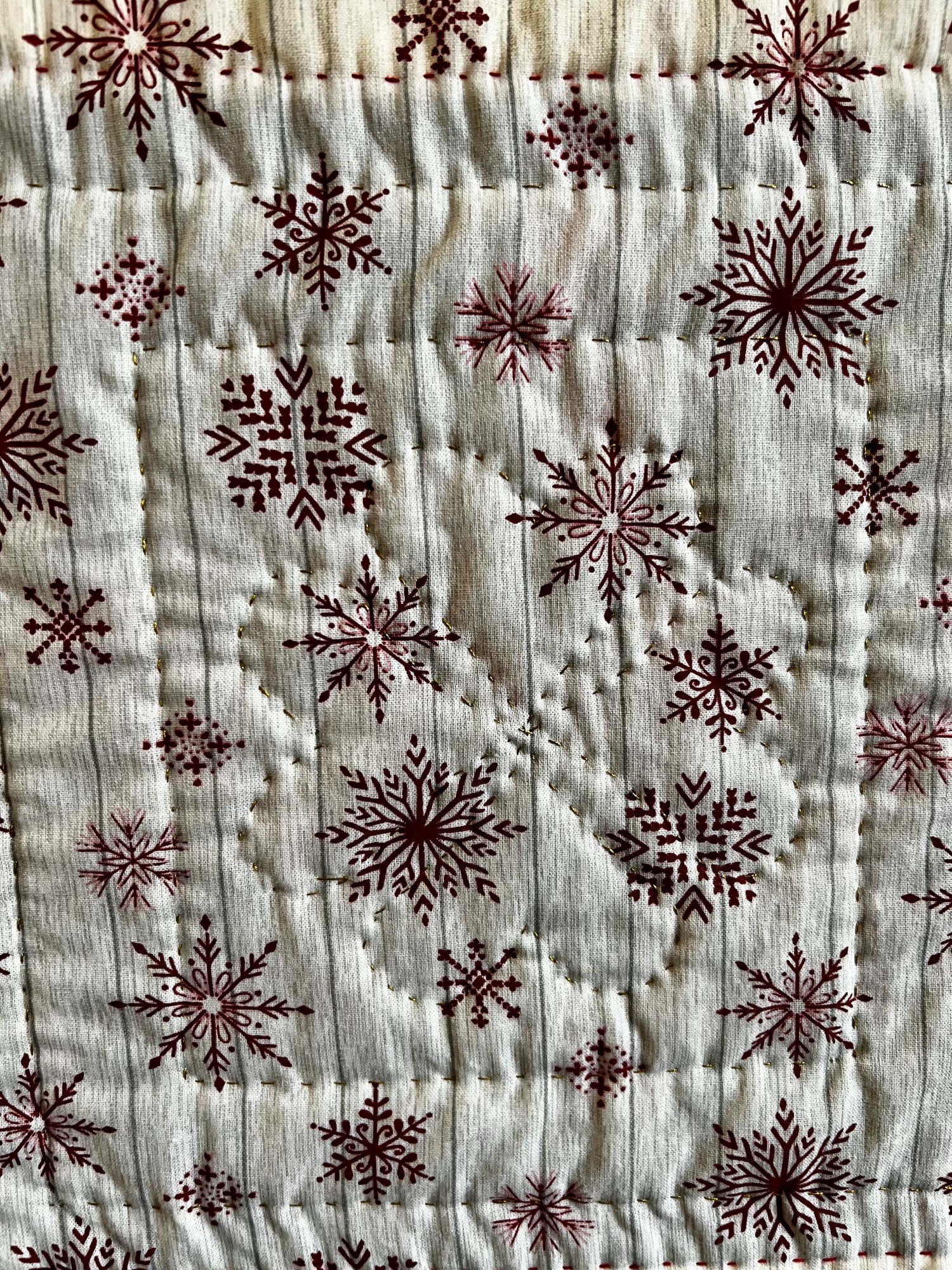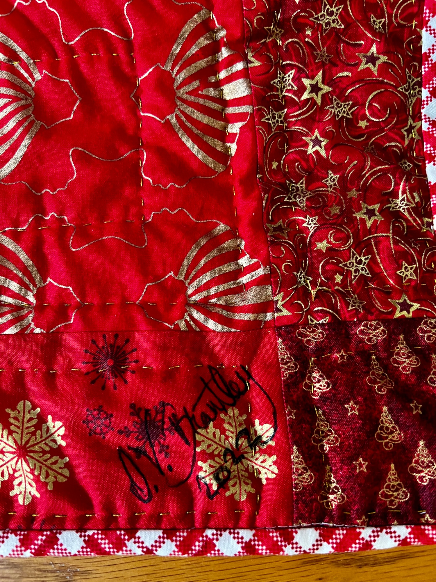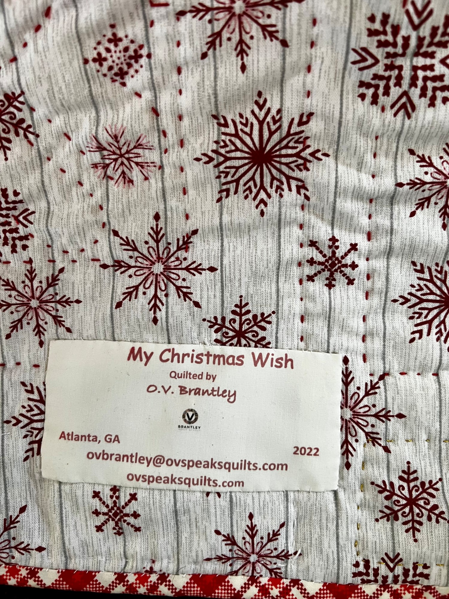 I lovingly hand quilted “My Christmas Wish” using red and white Perle cotton and gold metallic thread. It measures 67 X 84 inches so it can be used as a lap quilt or displayed on the wall.