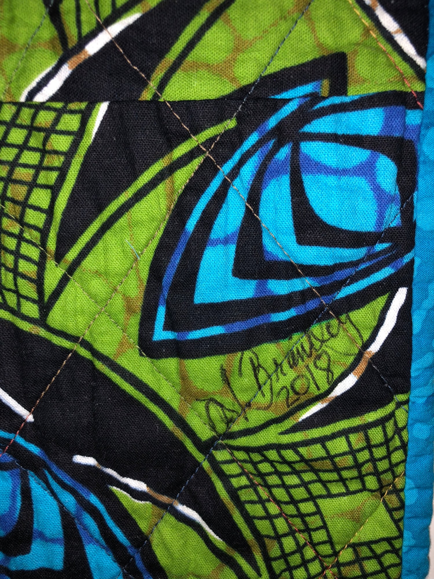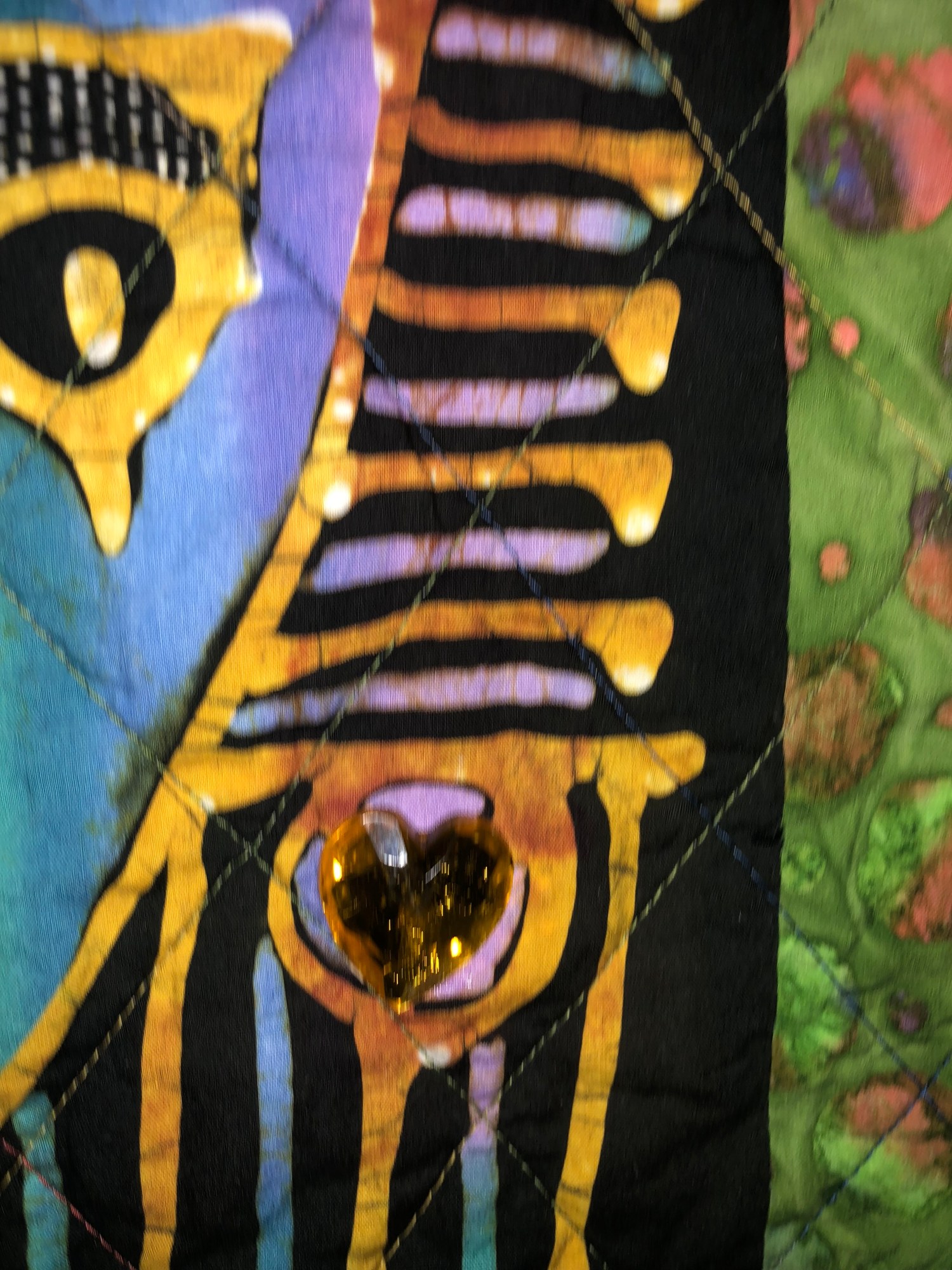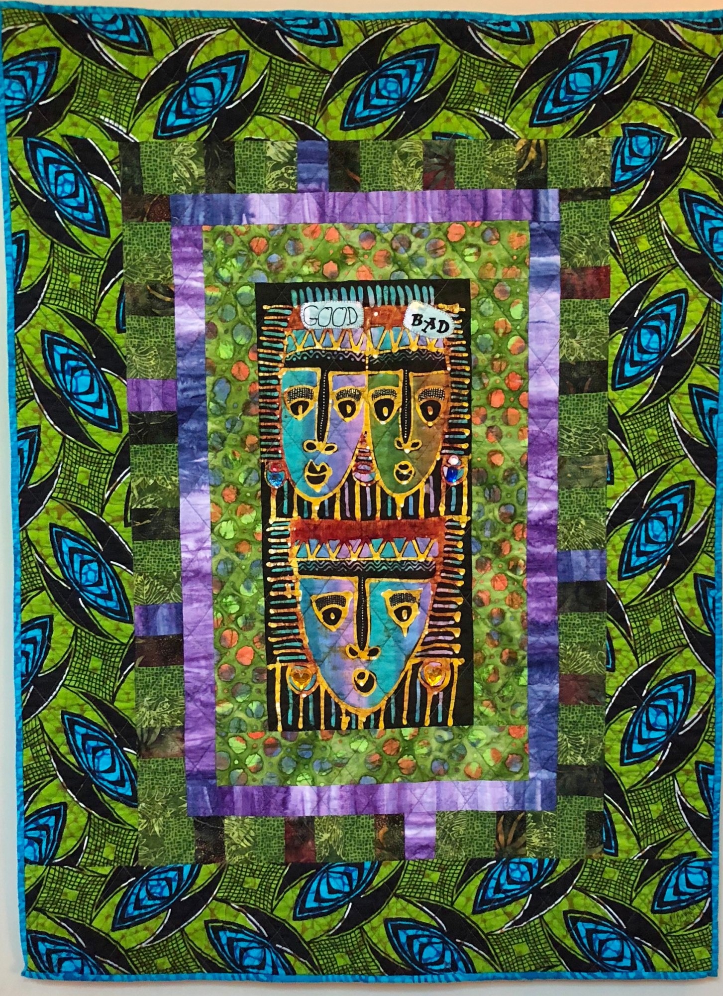 “My Evil Twin” measures 33x45 inches. I pieced and quilted it on my machine. The masks are embellished with crystal earrings and appliqués words. The masks are framed by batiks and African prints. The dominant color is green.