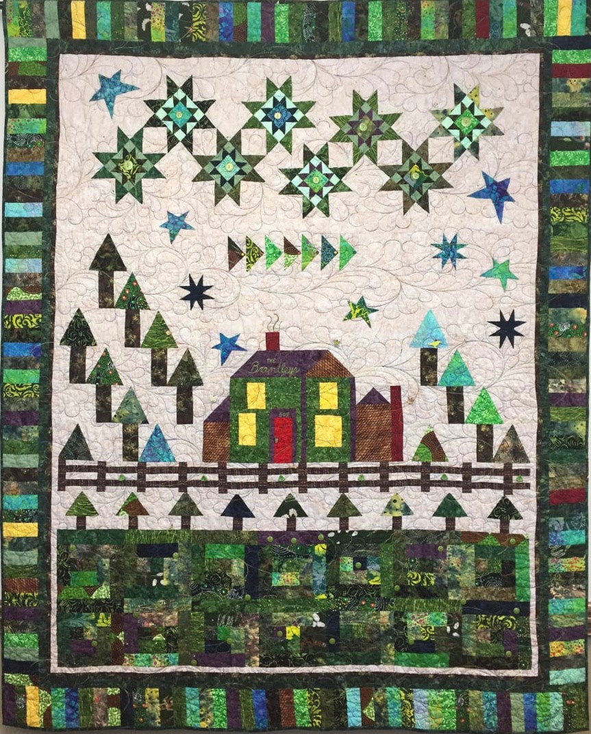 My neighborhood is permanently green with lots of happy twinkling stars. Machine pieced and machine quilted.