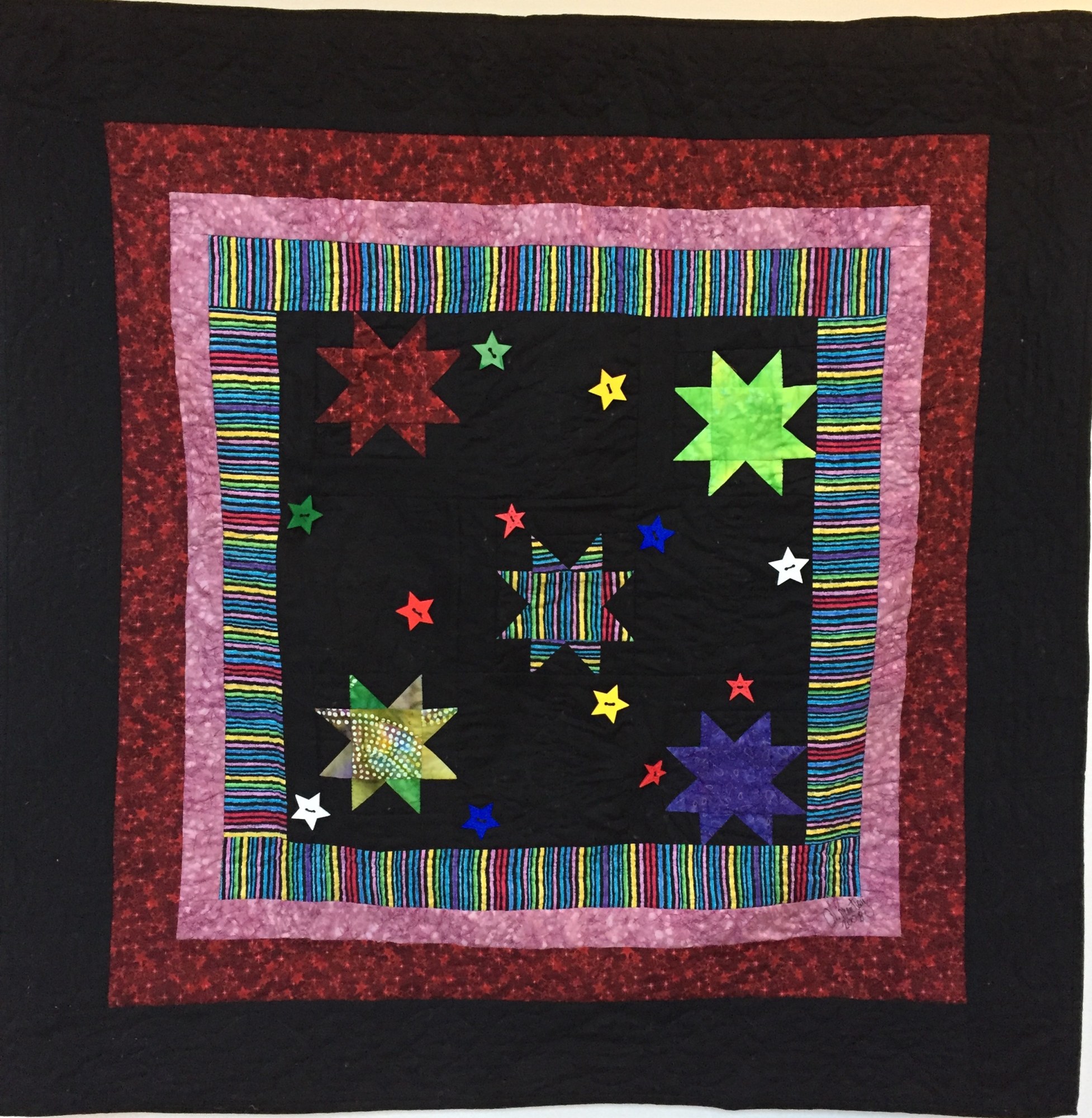 My Stars Got Rhythm is a quilted wallhanging measuring 39x39 inches. The five patchwork stars are surrounded by button stars. The treble clef musical sign is quilted in the black background. Four borders complete the piece.