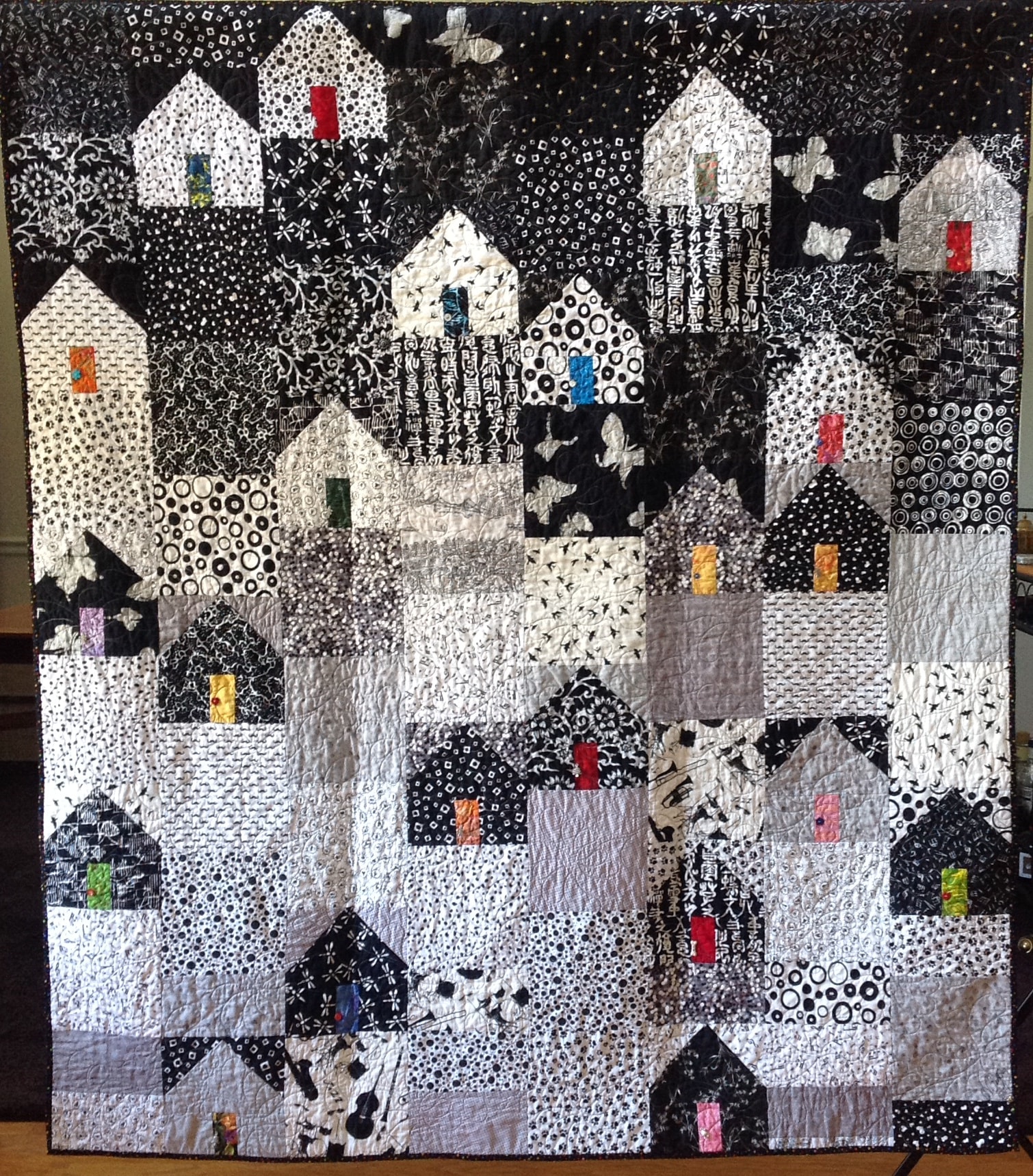"One DeKalb" depicts a landscape of black and white houses with colorful doors. The door handles are embellished with buttons, charms and other found objects. A close inspection of the fabric choices reveals that DeKalb County is a place full of music, diversity, flora and fauna.