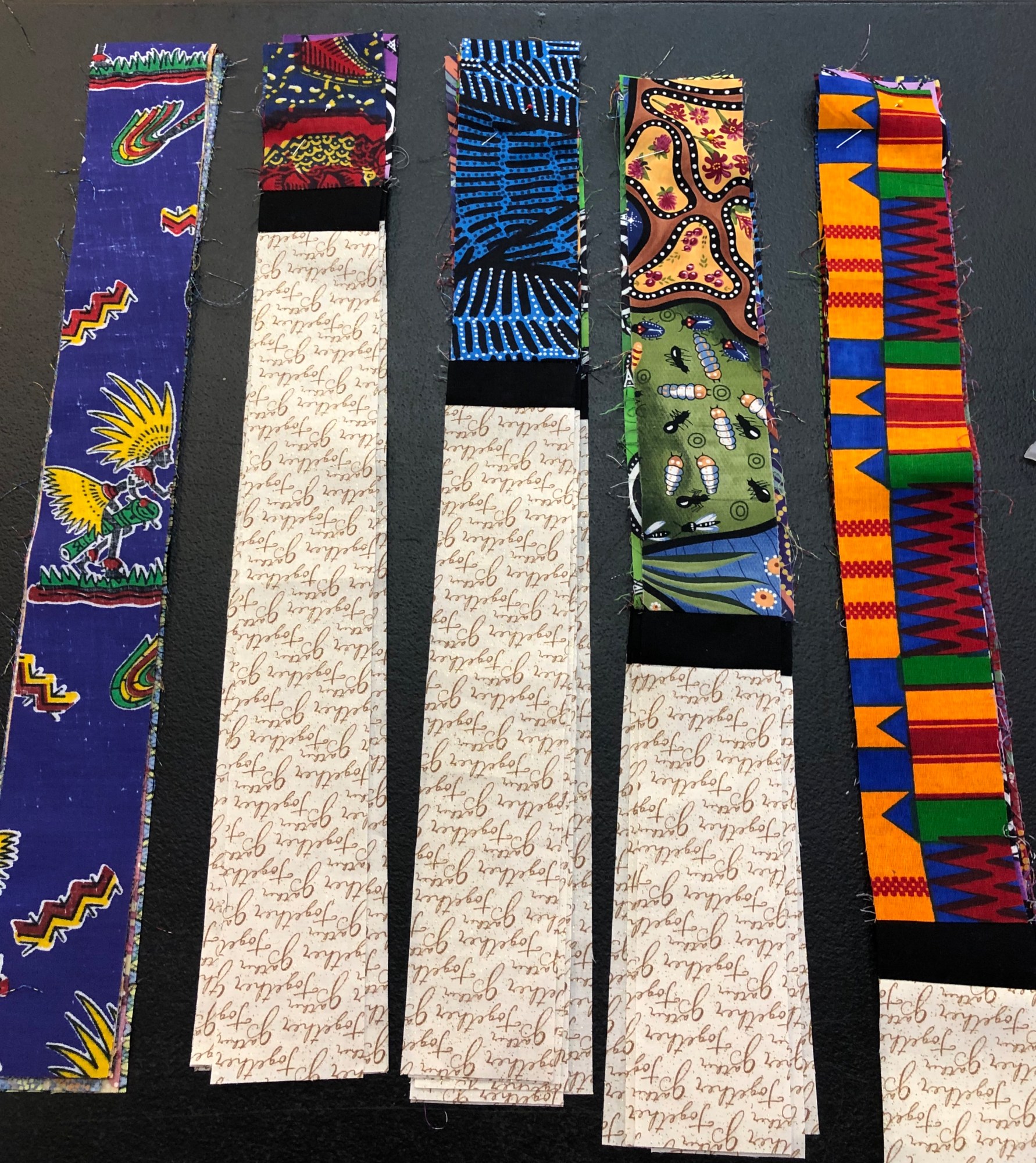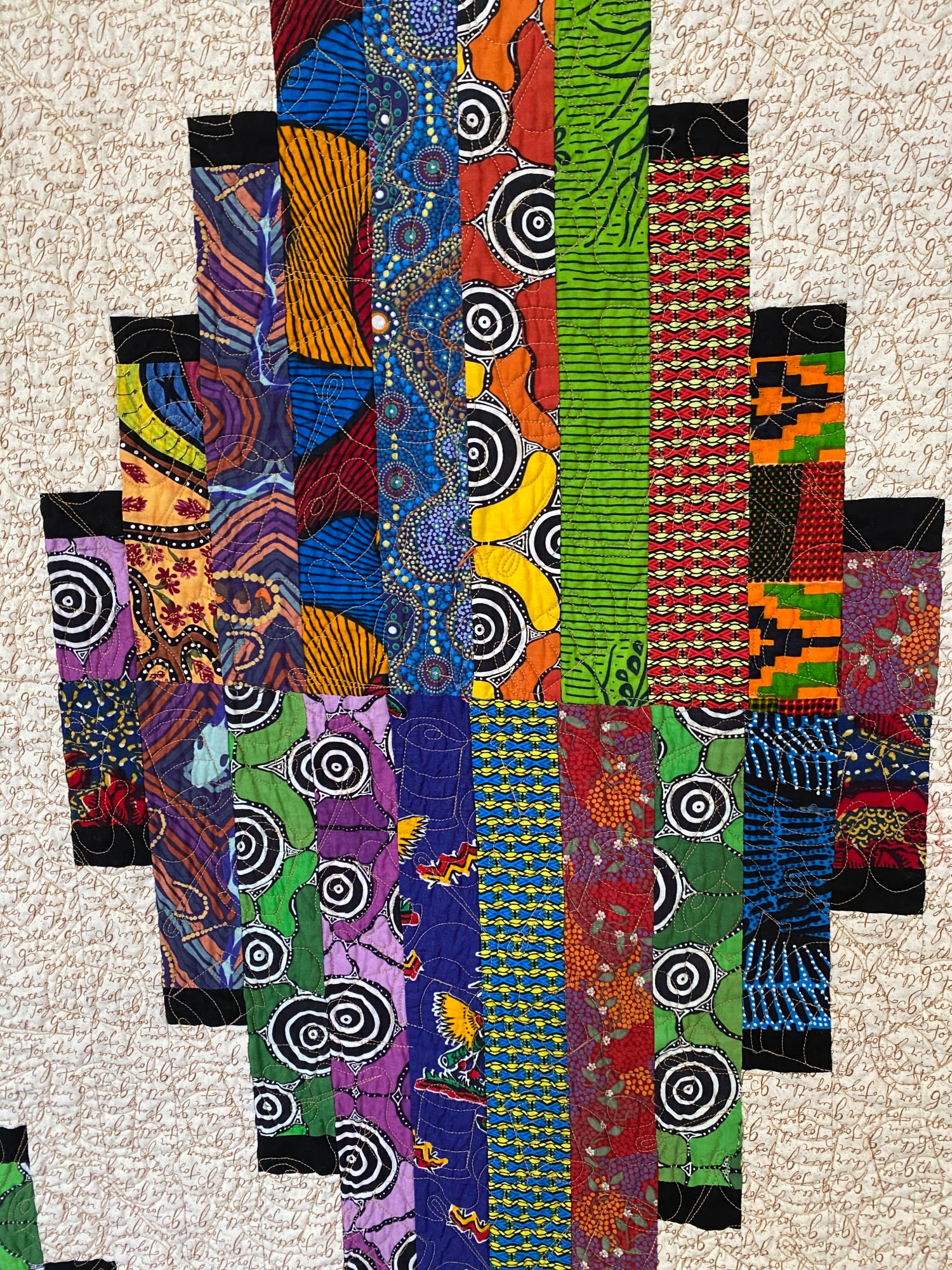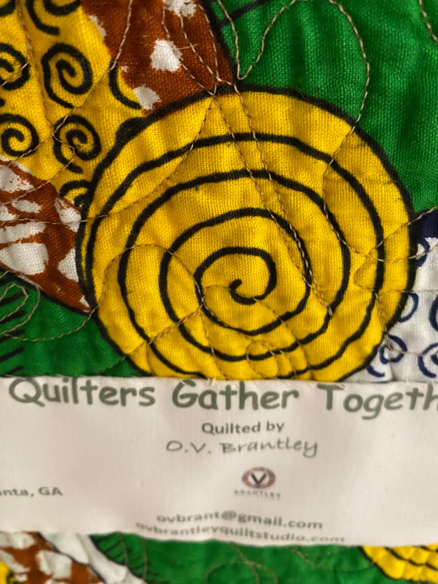 I started this quilt in a retreat with one of my quilt guilds the Welcome All Quilters. Our retreat was held at beautiful Vogel State Park in the north Georgia Mountains. All quilters made the same pattern which is by Cozy Quilt Designs. I chose Aboriginal and African prints for my quilt. The background has the words “quilters gather” written on it so “Quilters Gather Together” was born!