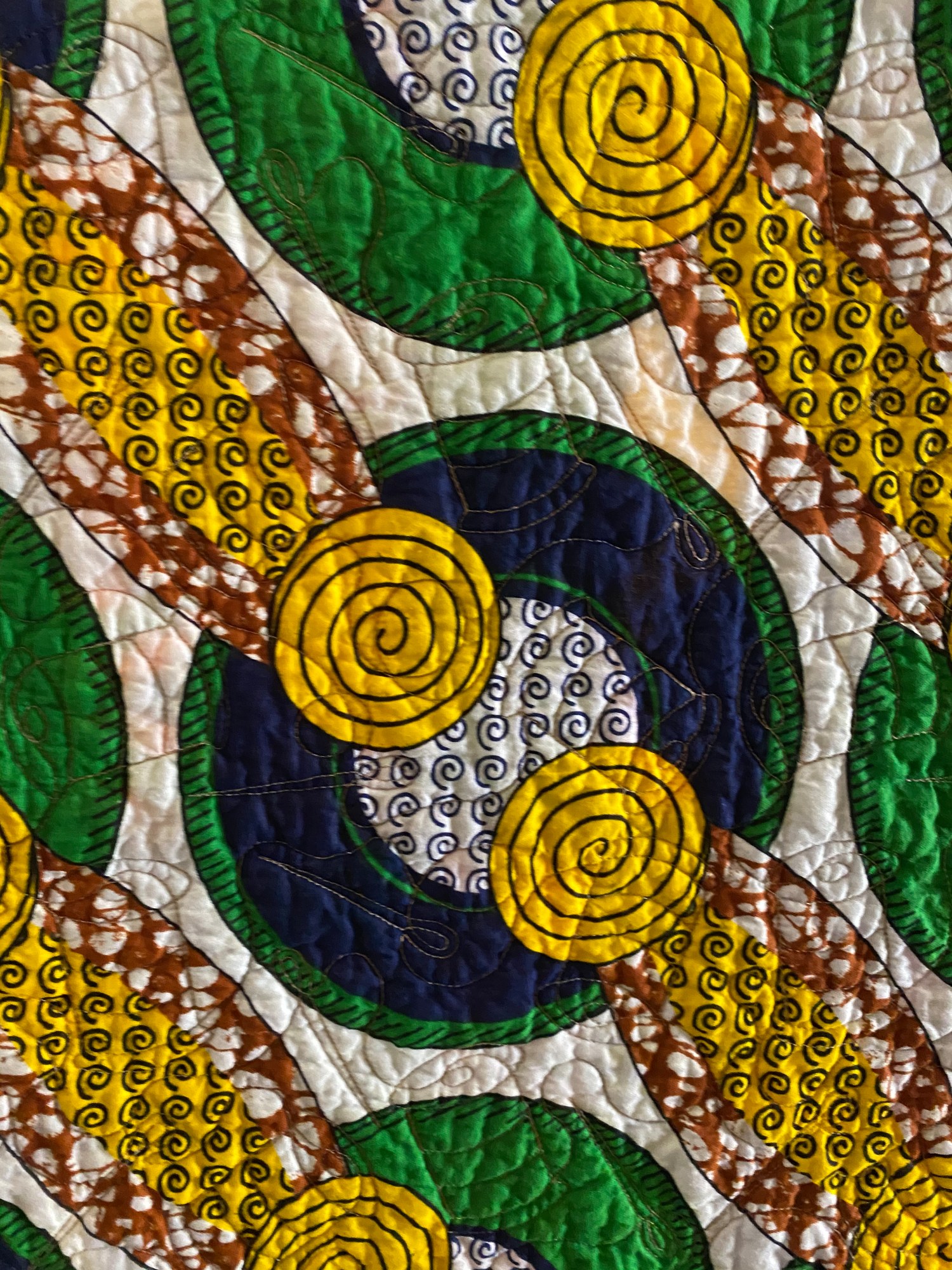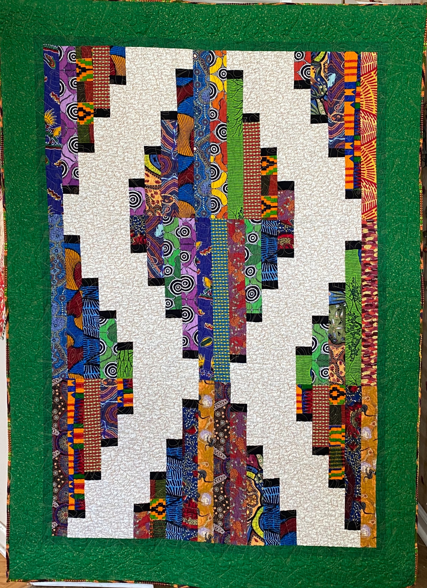 “Quilters Gather Together” measures 47 x 66 inches. It makes a striking wallhanging because of the ethnic fabrics and the geometric pattern. The dominant color is green but you hardly notice it because of the other fabrics. The binding is a traditional African Kente fabric.