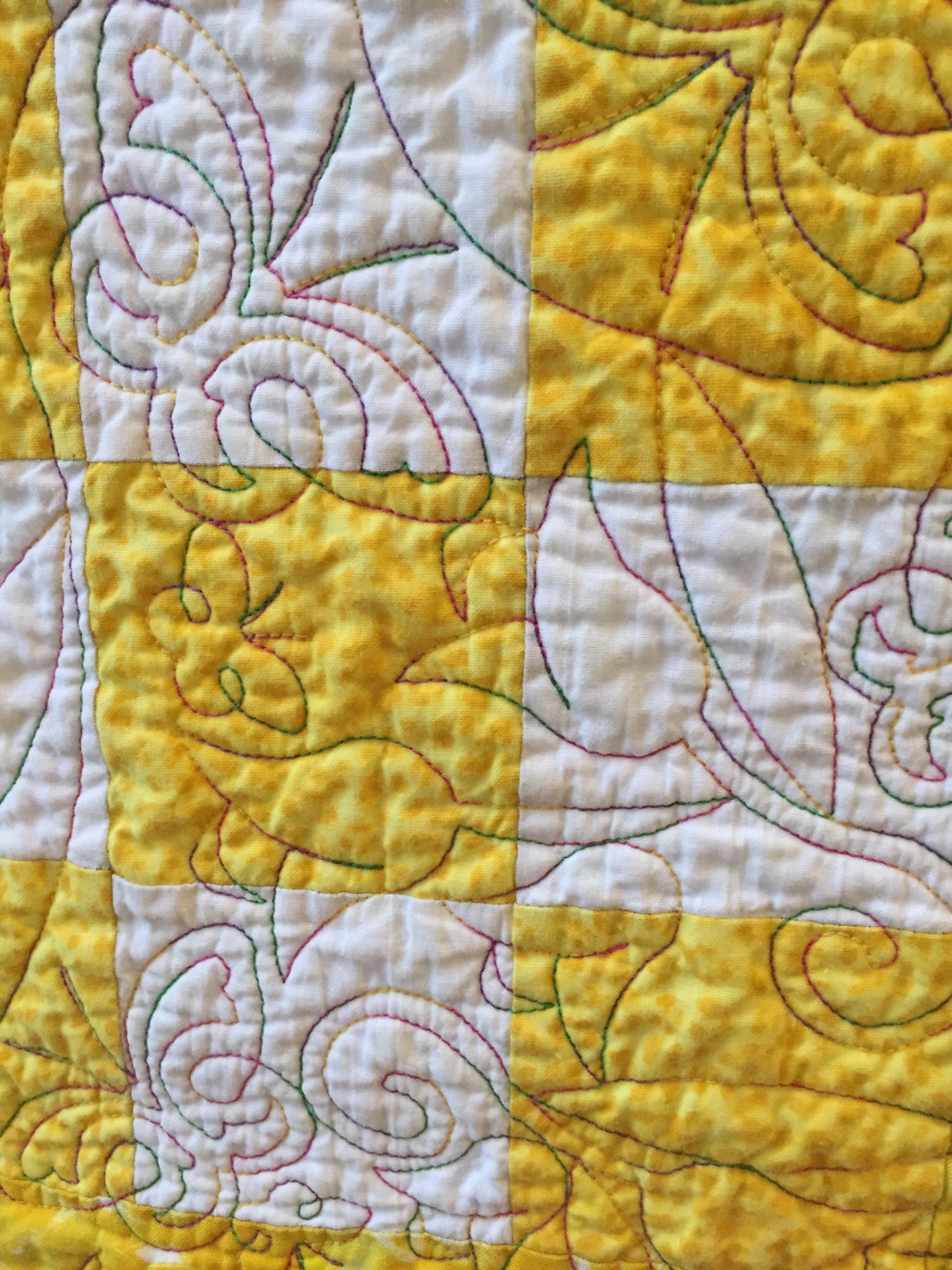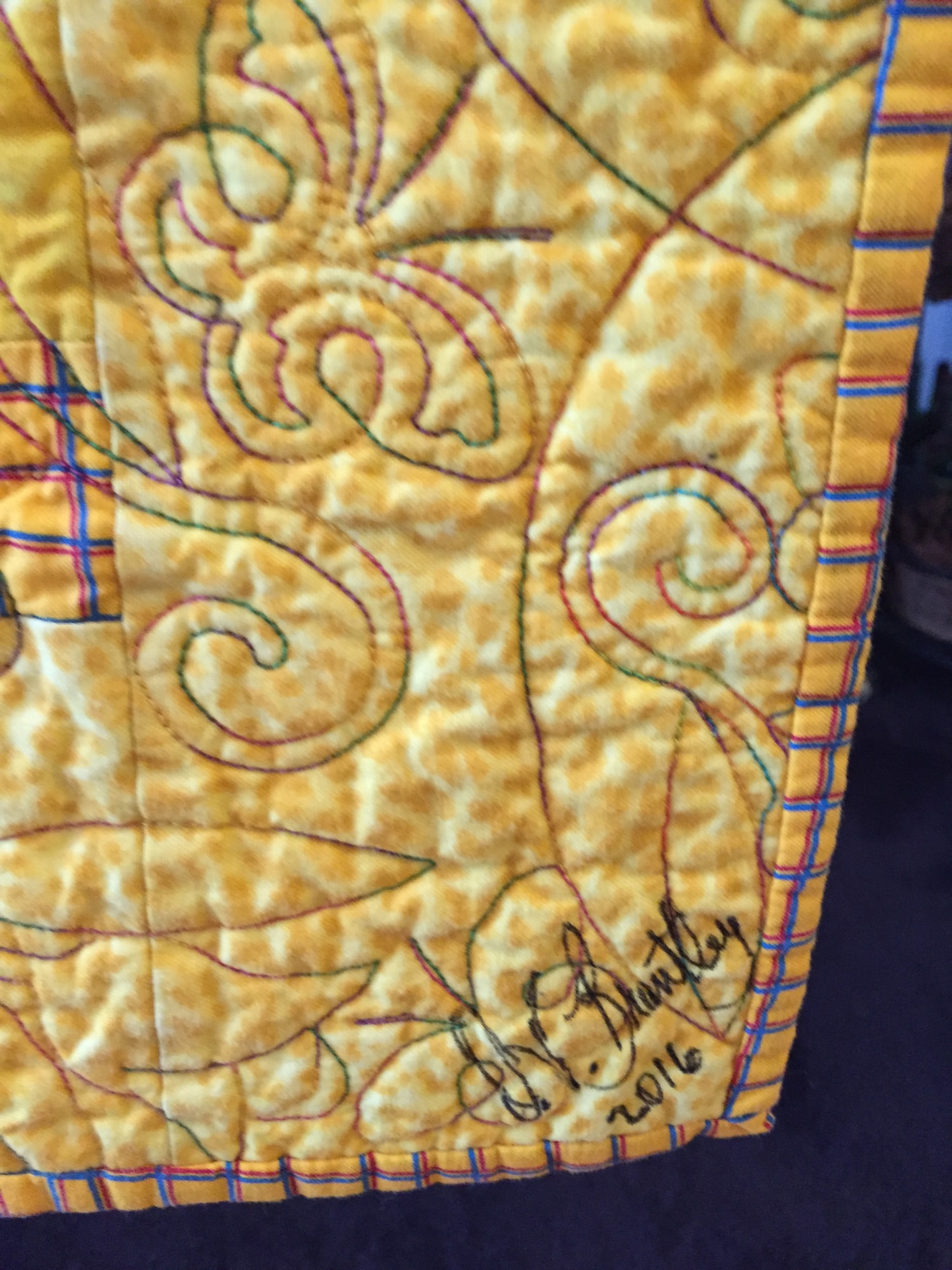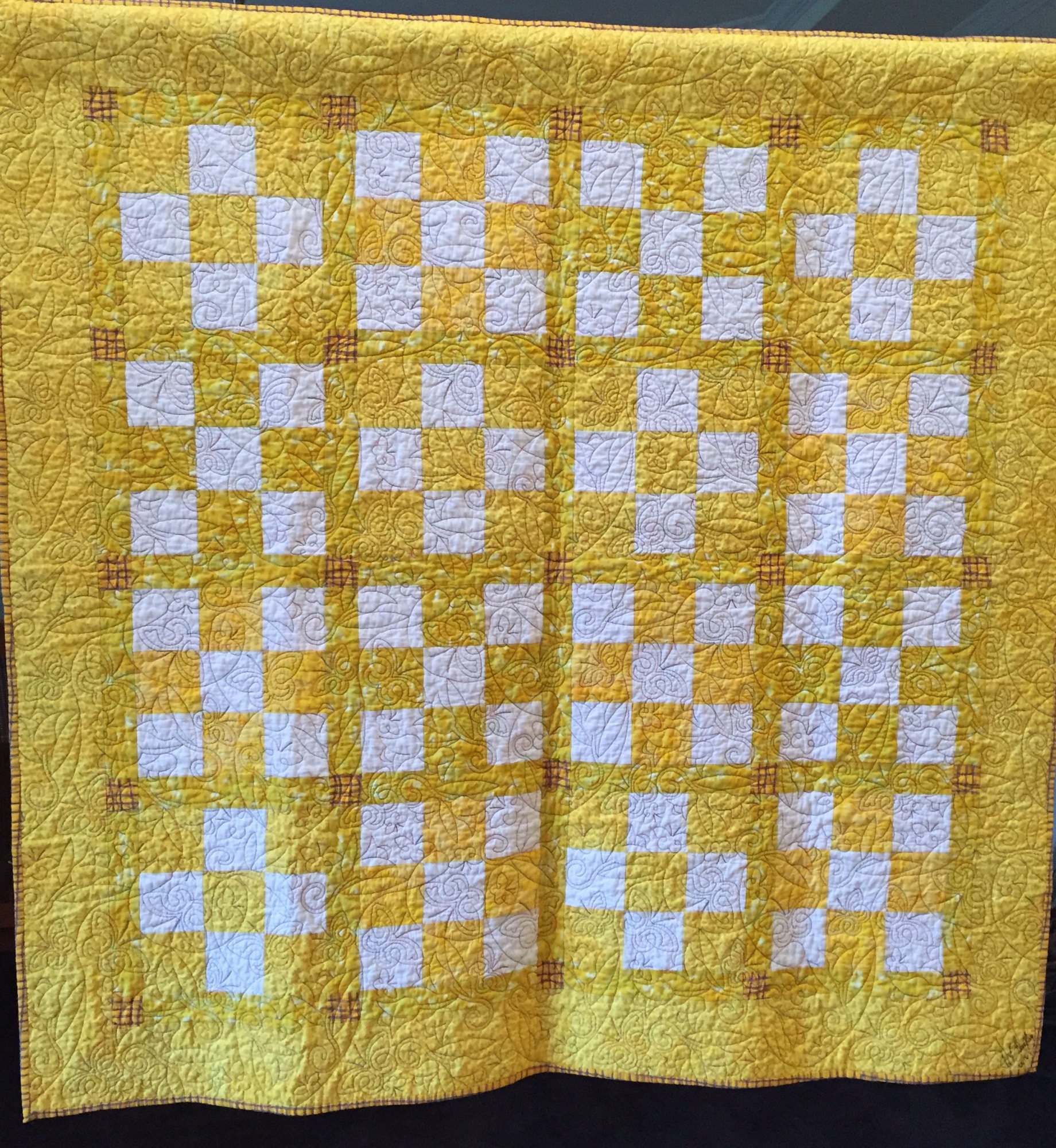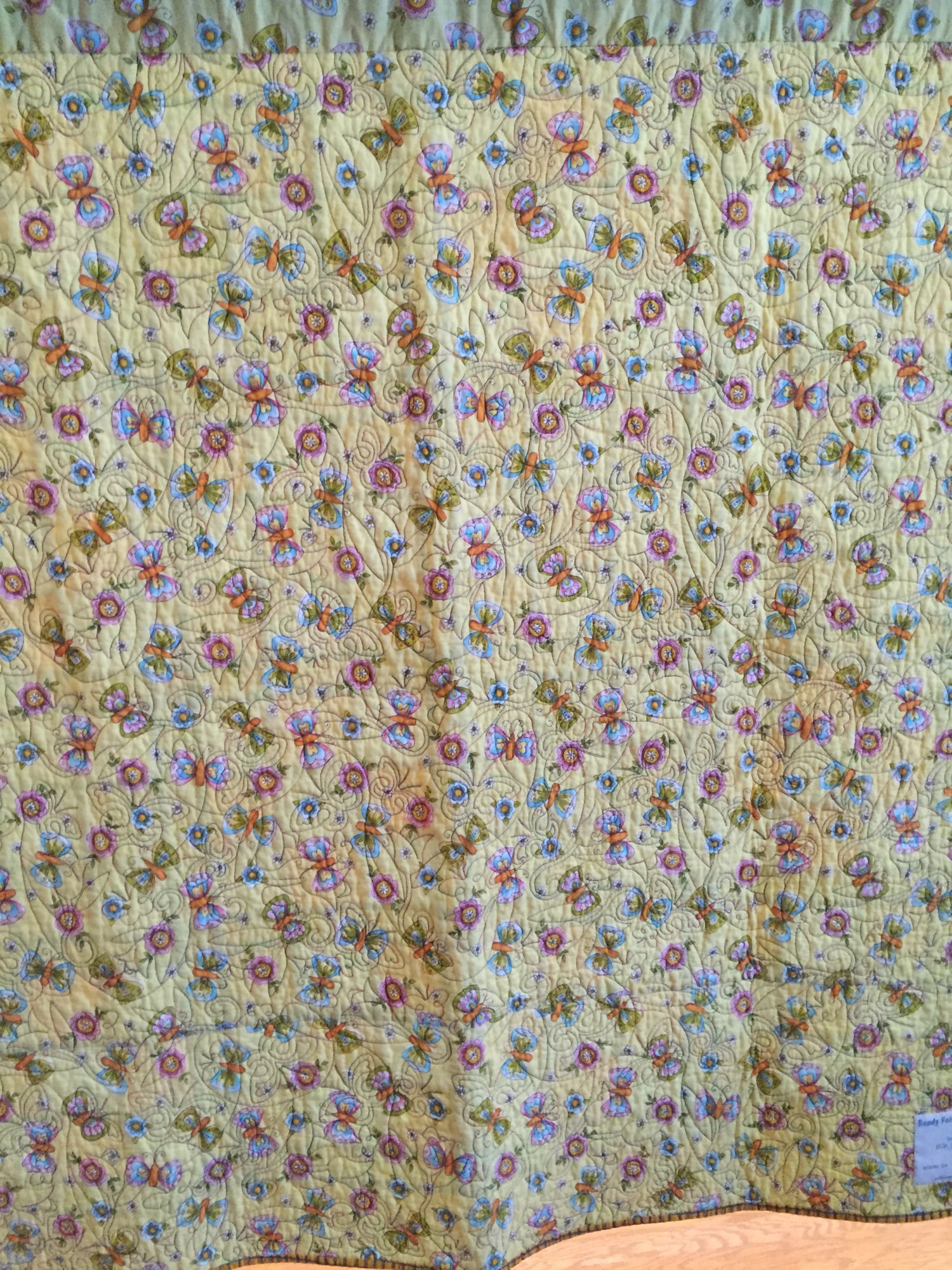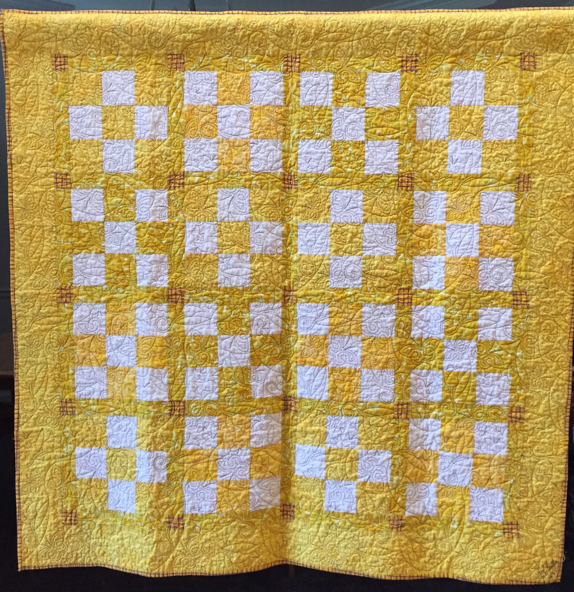 A traditional nine patch quilt done in yellow. Butterflies and flowers are machine quilted in the background by Janece Risty. The back completes the theme with a fabric motif of butterflies and flowers.