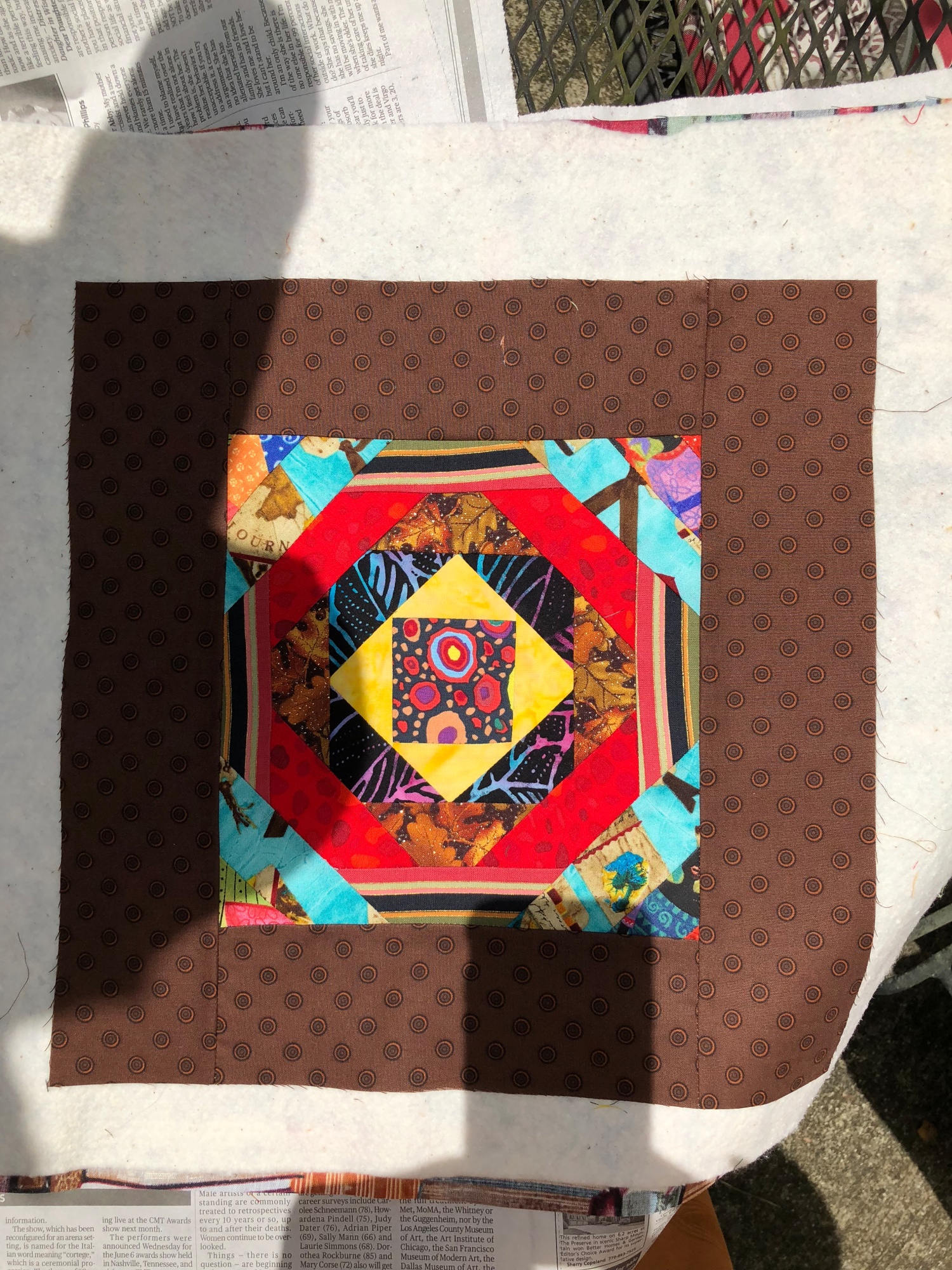 Scrappy pineapple block with library fabric on the back