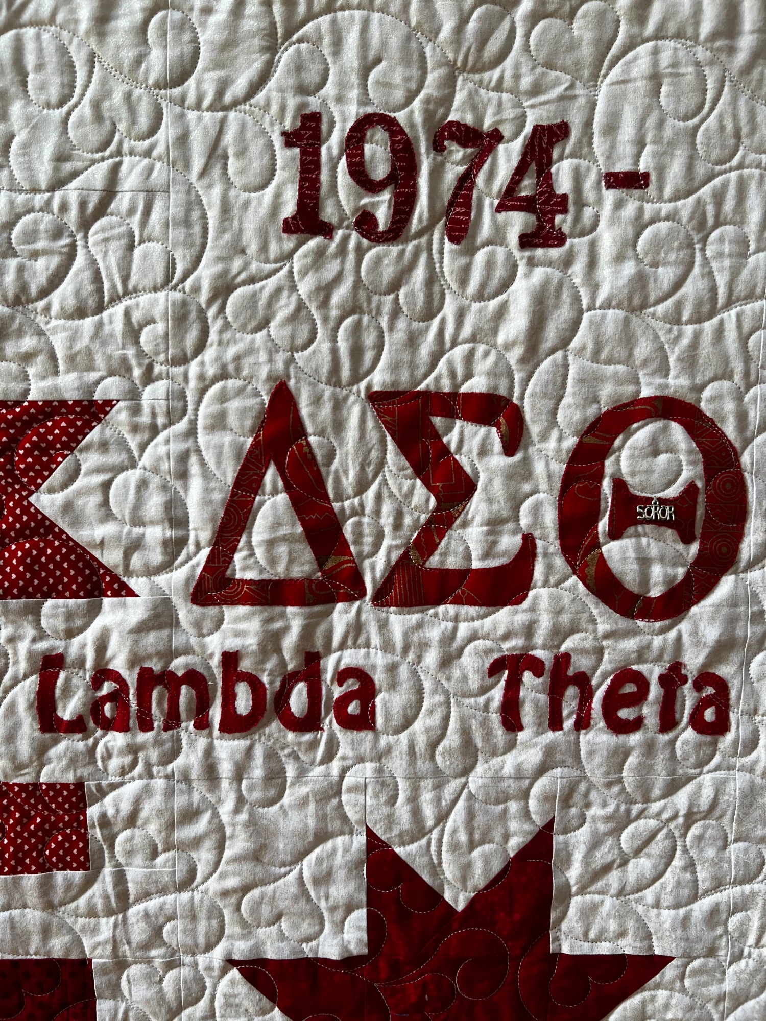 My quilt tells the story of being part of a group of young ladies who chartered the Lambda Theta Chapter of Delta Sigma Theta sorority at the University of Arkansas at Fayetteville in 1974. The beauty of that sisterhood continues to this day, as does my love of red and white quilts.