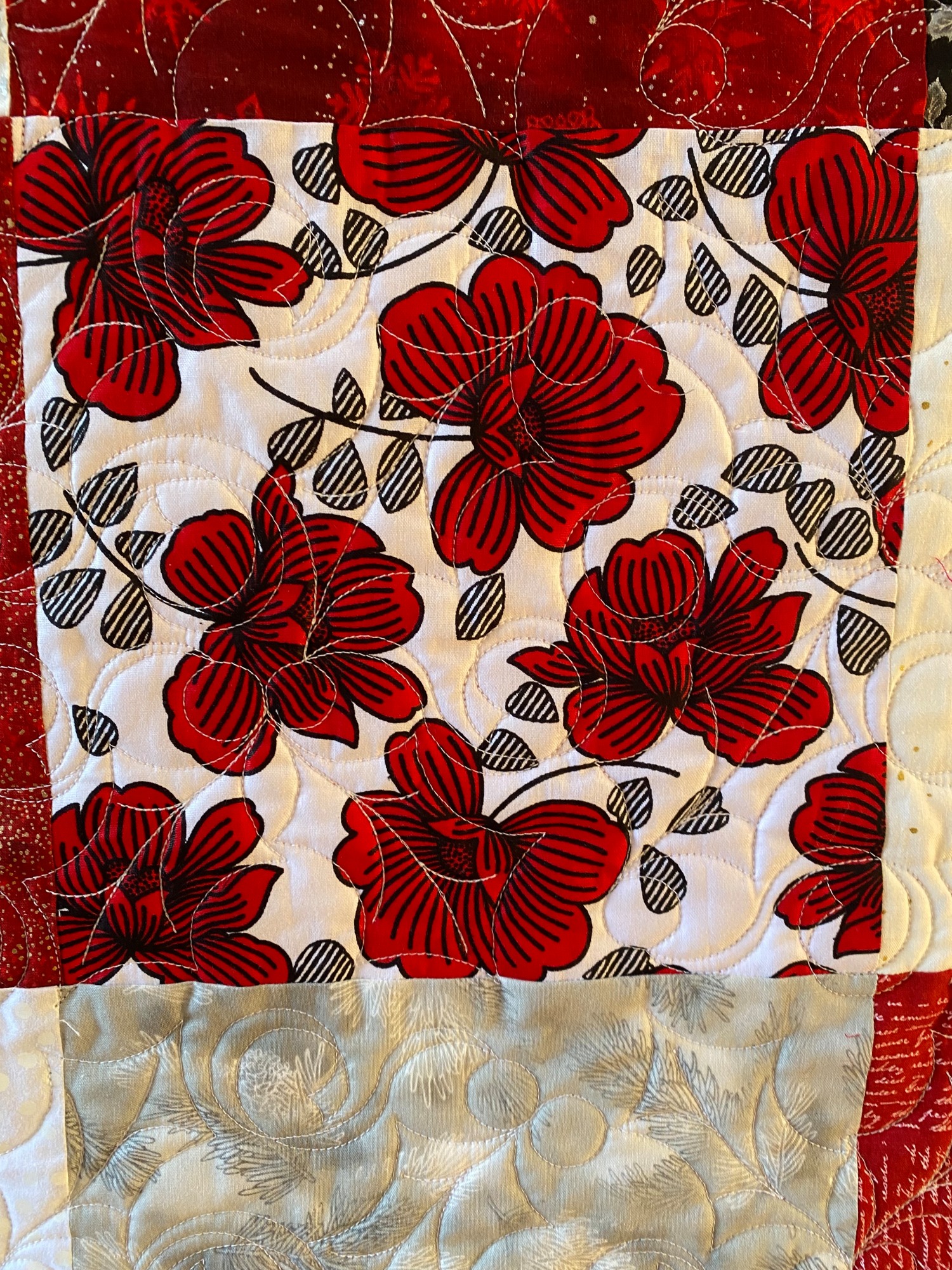 My long arm quilt Maxine Moore quilted a festive holly leaf in the the background of the quilt.
