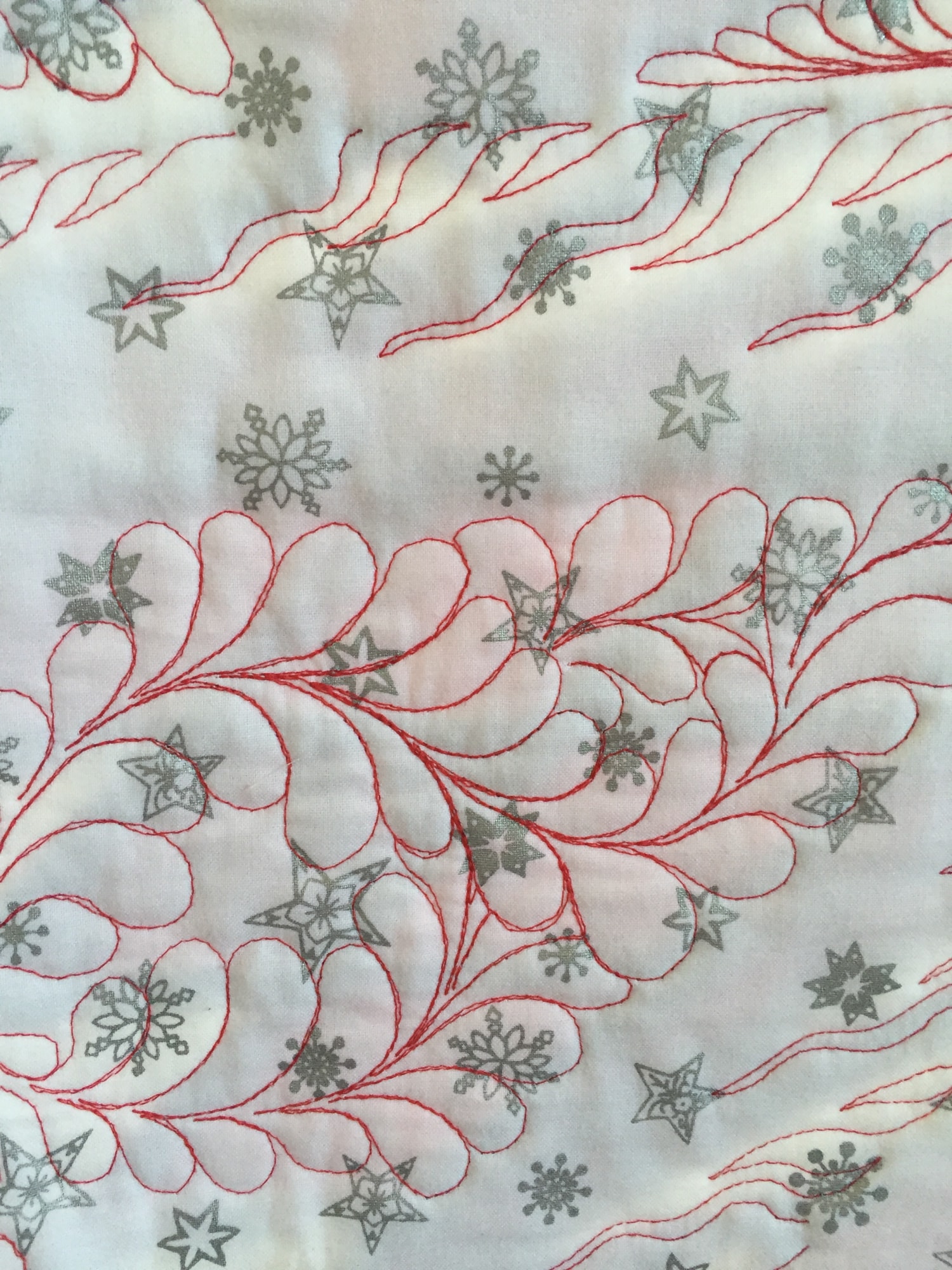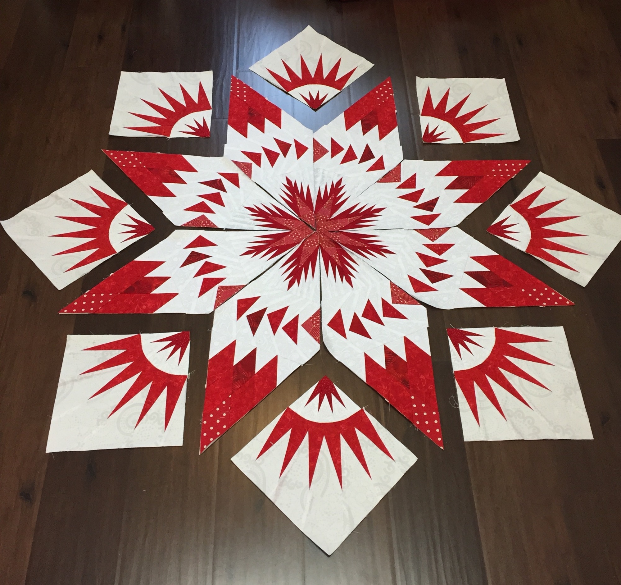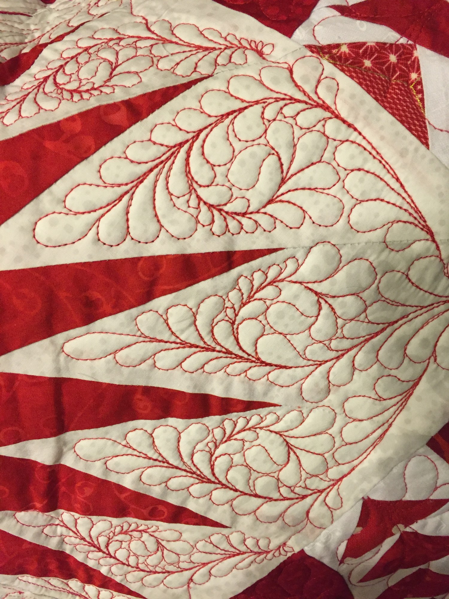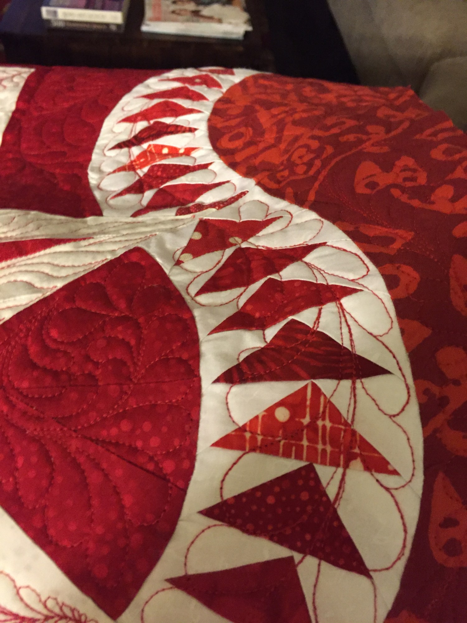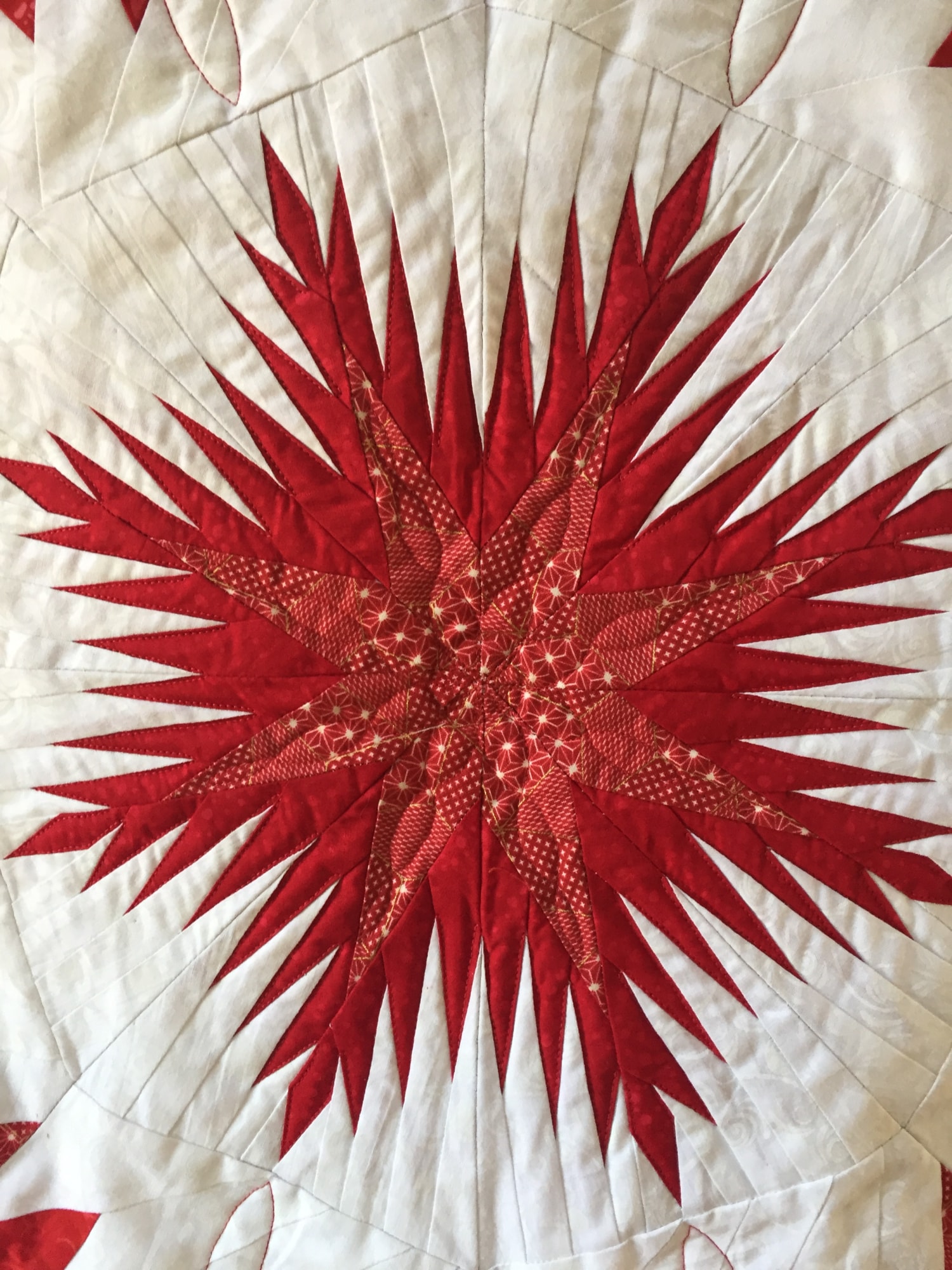 I chose Judy Niemeyer's Glacier Star pattern and made it in red and white. I wanted the quilt to sparkle like India's personality. Some of the reds have a little gold metallic in them. The white fabric behind the flying geese has musical notes. I imagine the geese are singing. The outer border gives the quilt an ethnic touch.