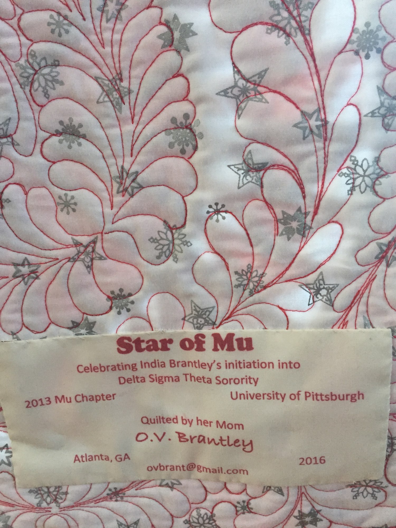 India pledged the Mu Chapter of Delta Signa Theta at the University of Pittsburgh in 2013. It took me 2 years to find the perfect quilt pattern for such a life changing occasion.