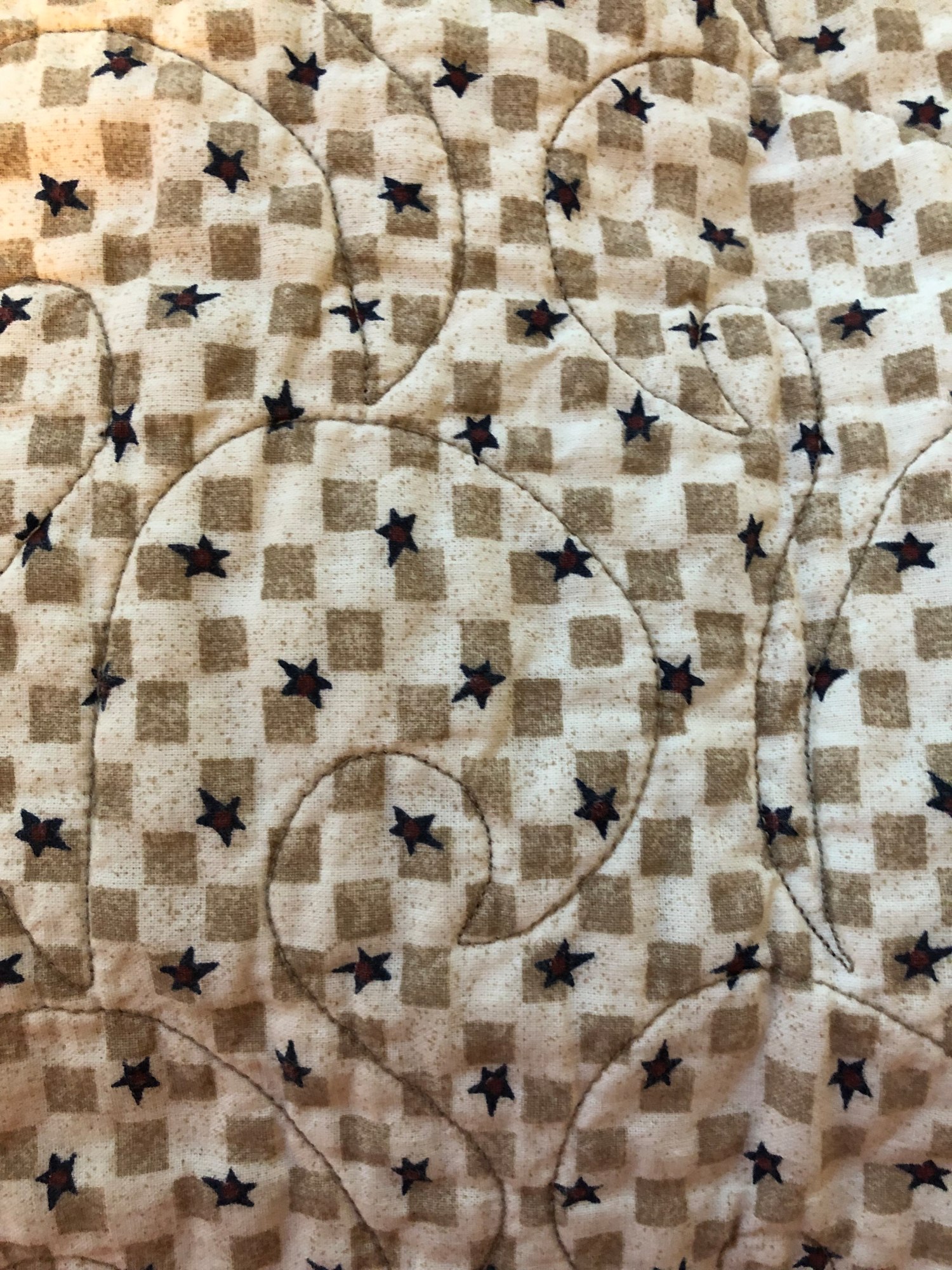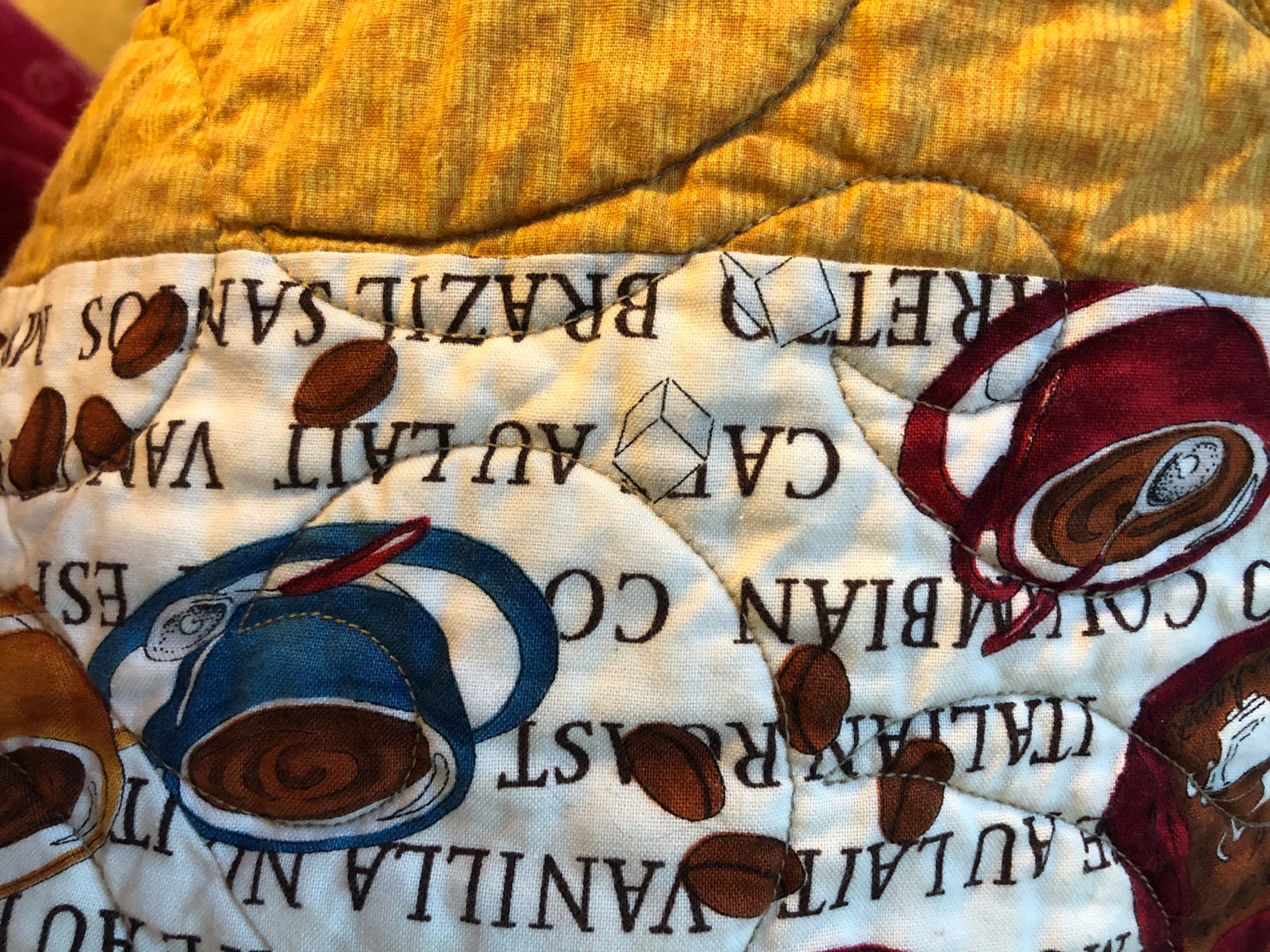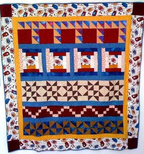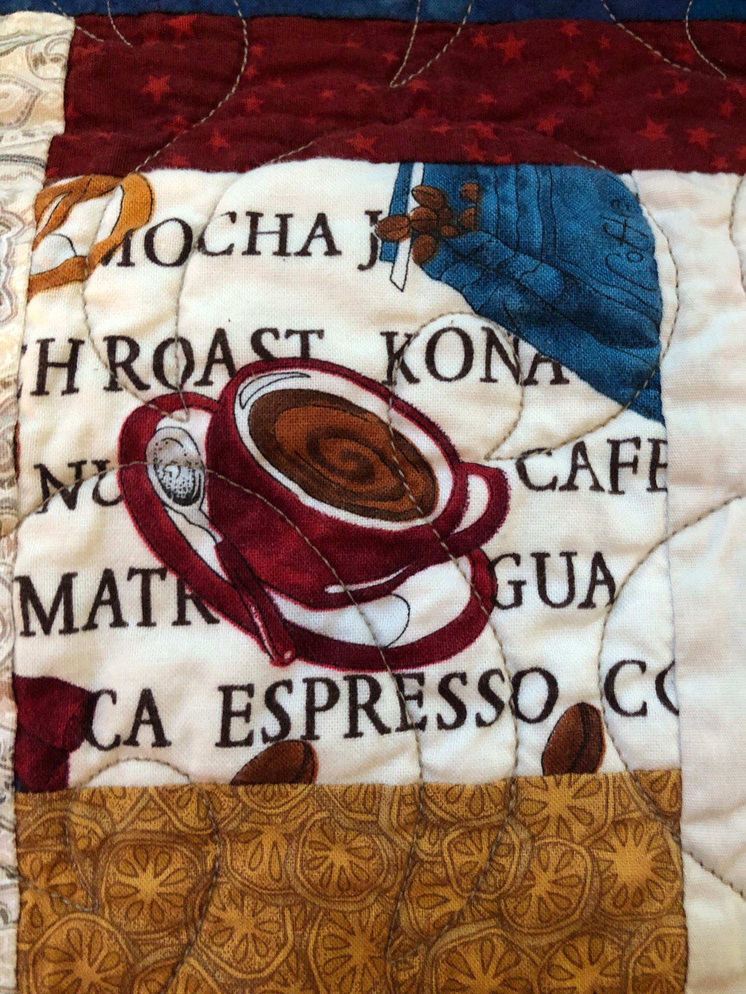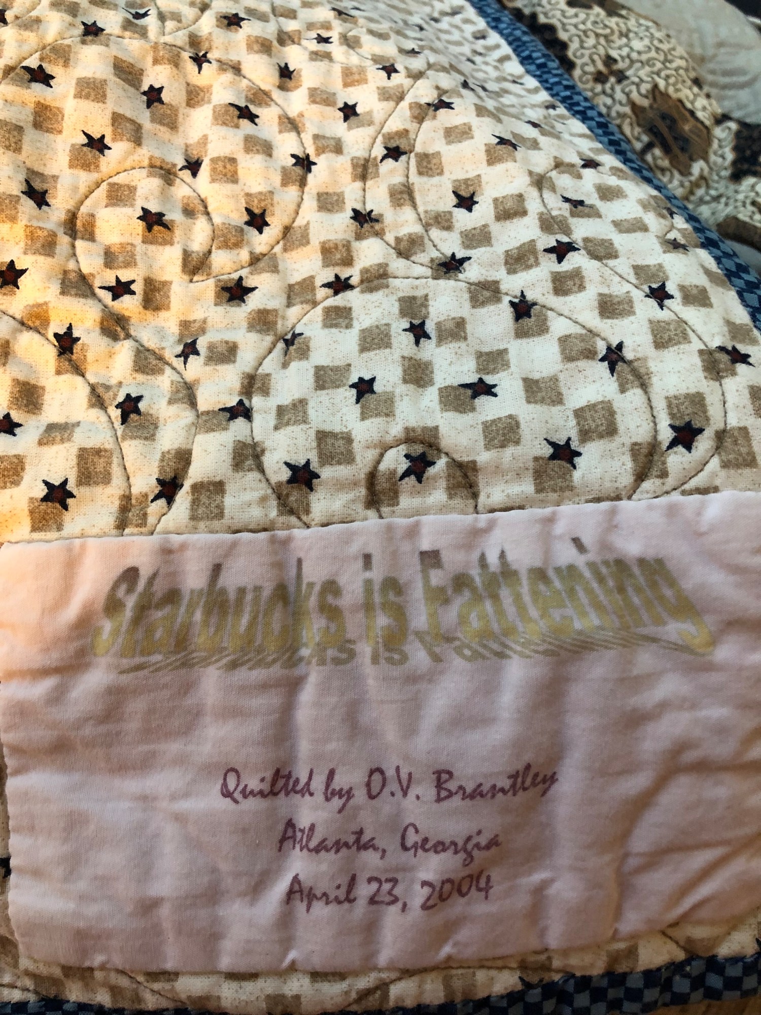 Starbucks is Fattening measures 59 x 62 inches. The quilt gets its name from the coffee motif in the border. It is a tribute to all women who skip meals hoping to lose weight while drinking fully loaded coffee drinks. It is machine pieced and quilted and is a row by row quilt.