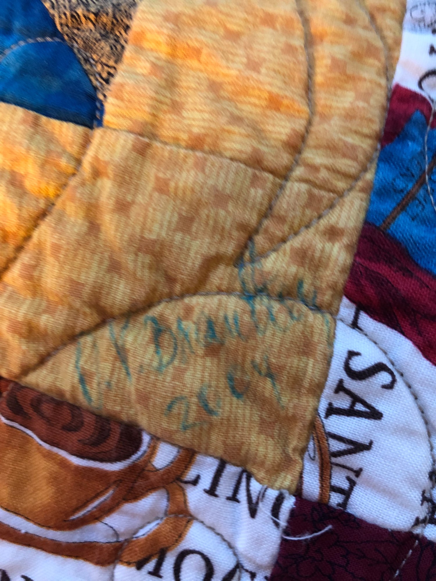 The dominant colors are blue, burgunday and brown. It is signed and dated by the quilter O.V. Brantley.