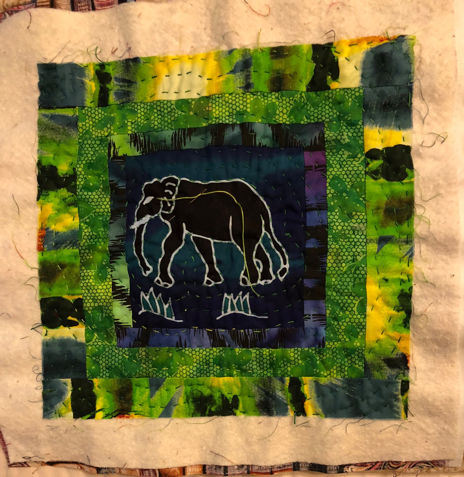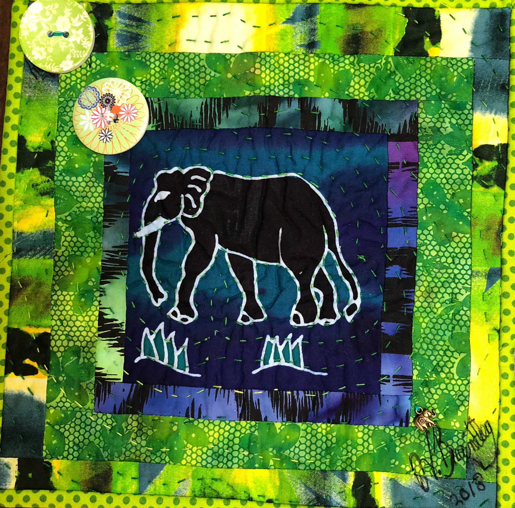 “Strong Elephants in My Library#3” is a miniature quilt that measures just 10 x 10 inches. The focus of the quilt is a black elephant on a blue background. It is bordered by shades of green.