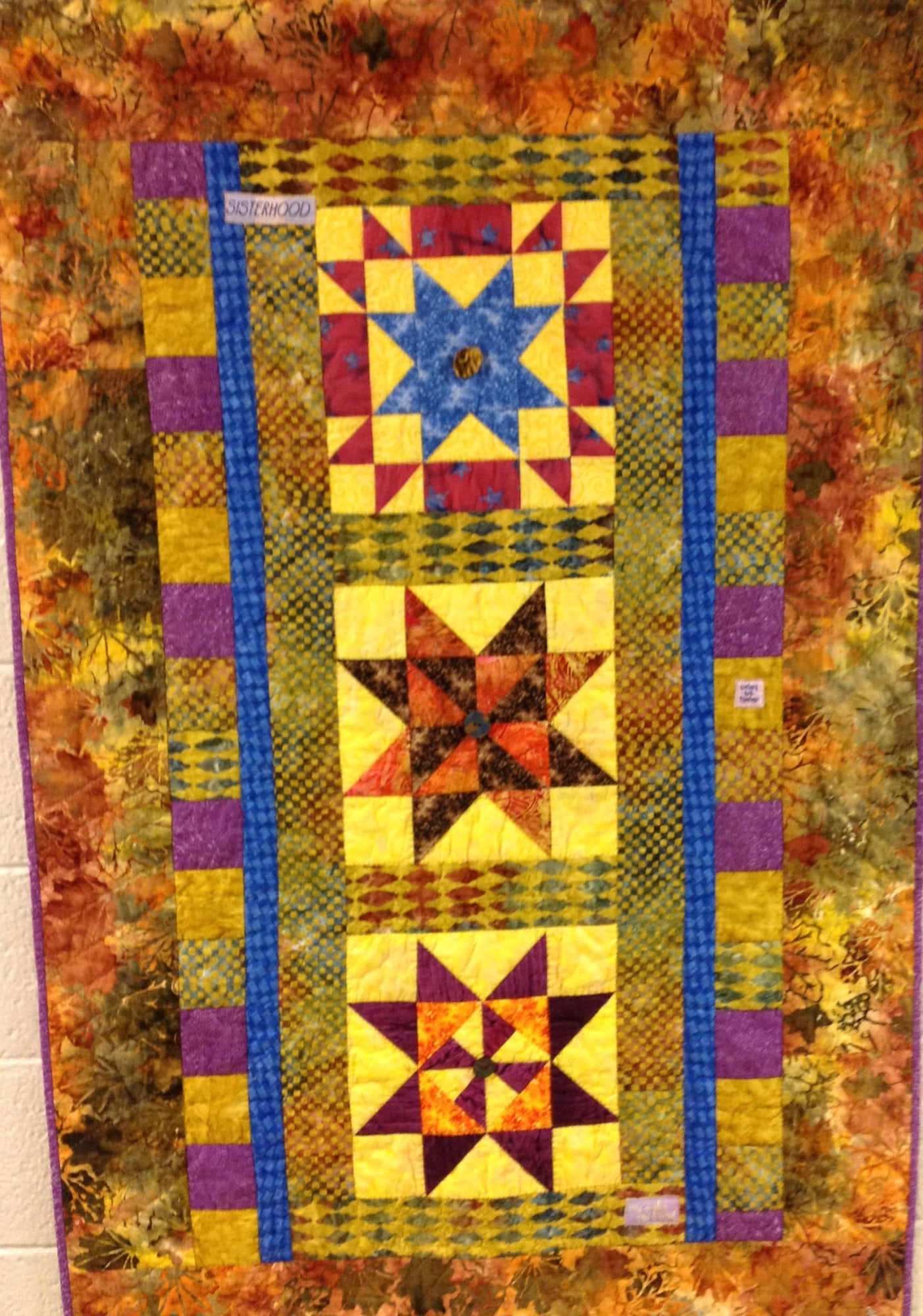 "Three Sisters" is a quilted wallhanging that starts with three traditional star blocks. Gold batiks figure prominently in the piece with a pop of purple. It measures 38 x 58 inches.