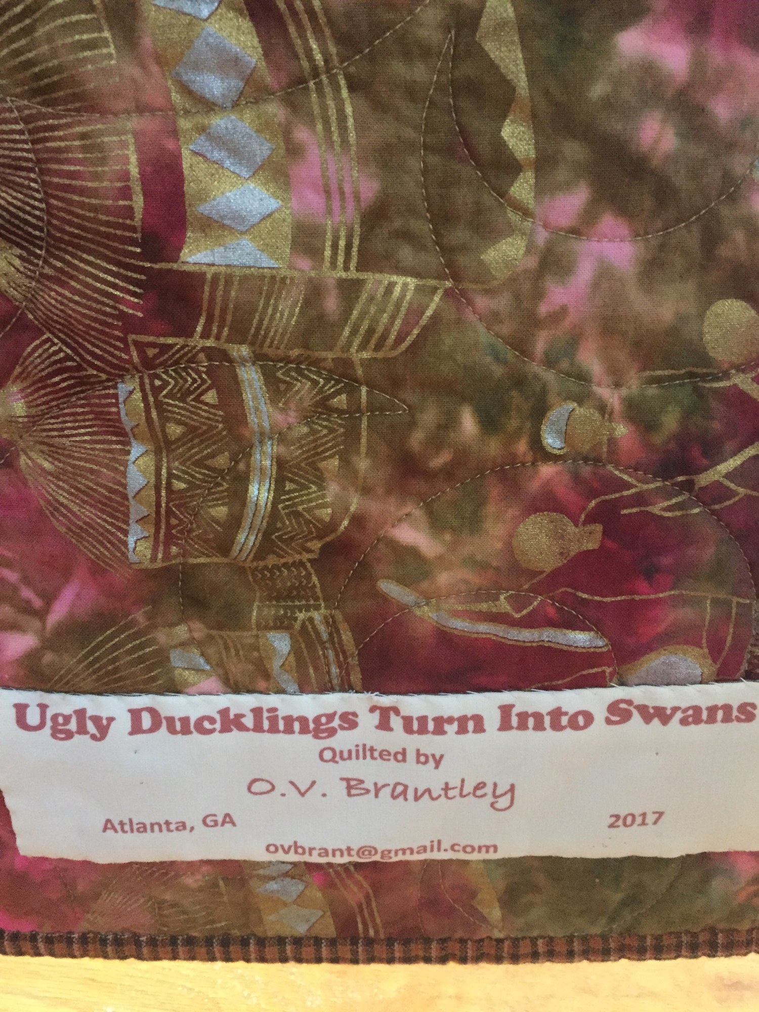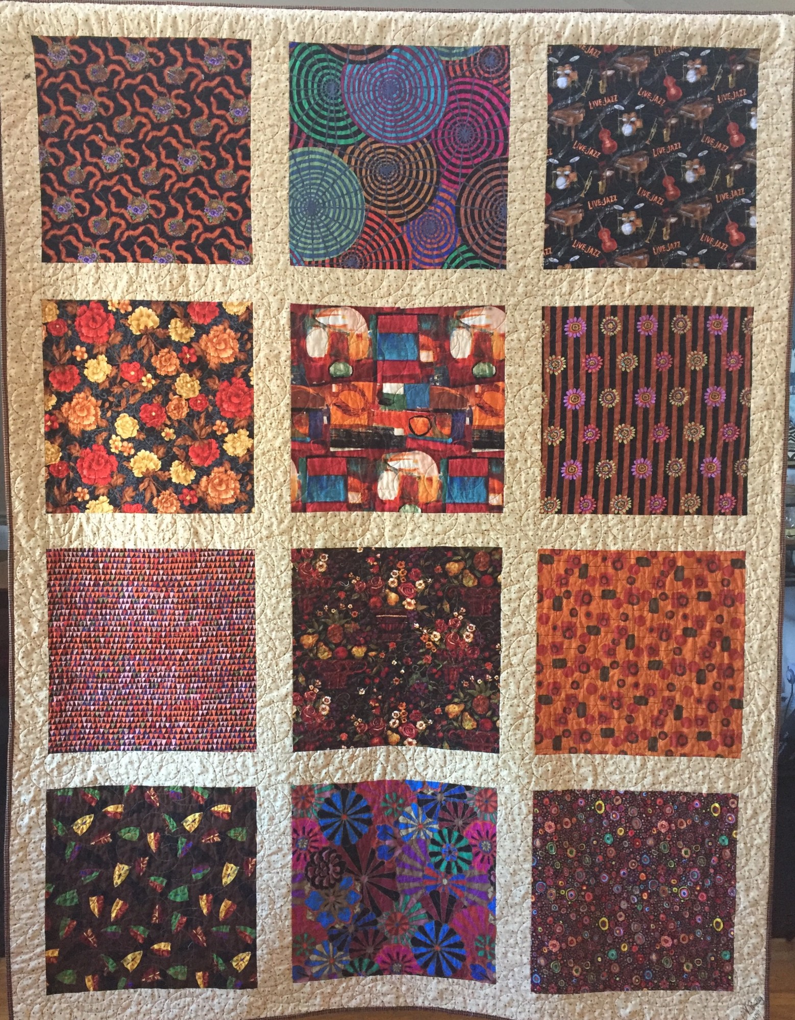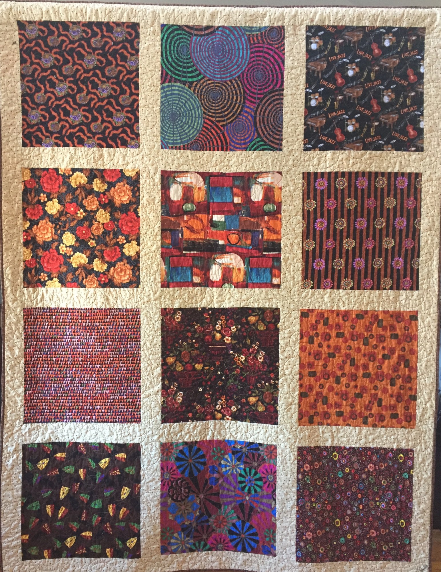 12 big squares of beautiful fabrics make this quilt look like a traditional sampler quilt. The pattern is from the book "Material Obsession" by Kathy Doughty. Because it is such a simple quilt, I thought it would be an ugly quilt. I was wrong! After it was finished, I loved it and instantly named it "Ugly Ducklings Turn into Swans"!