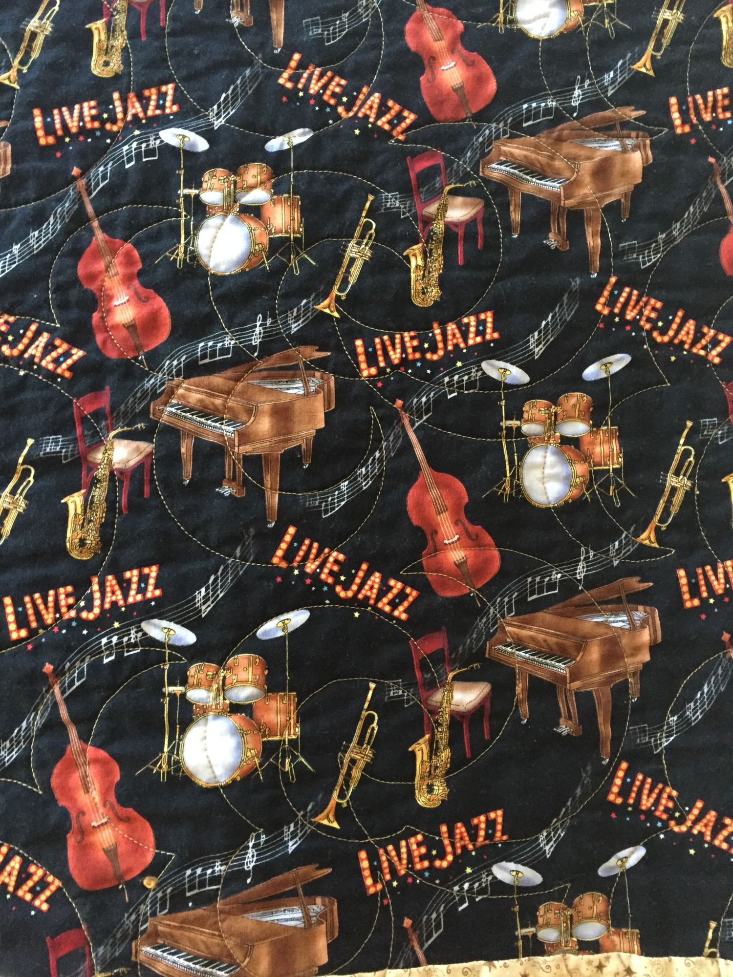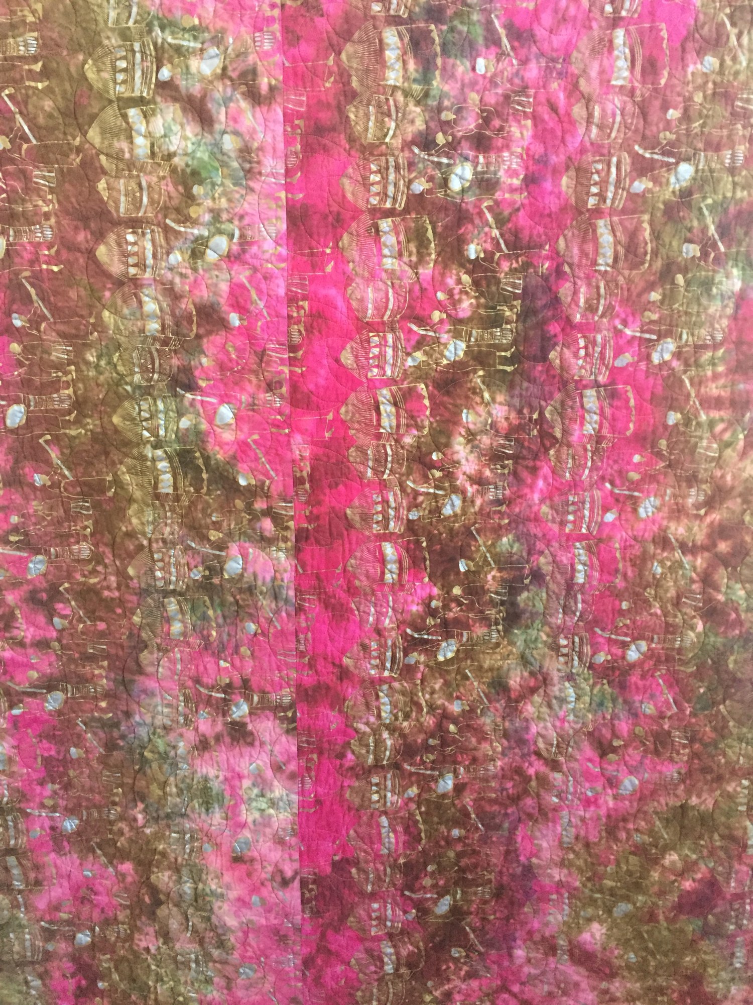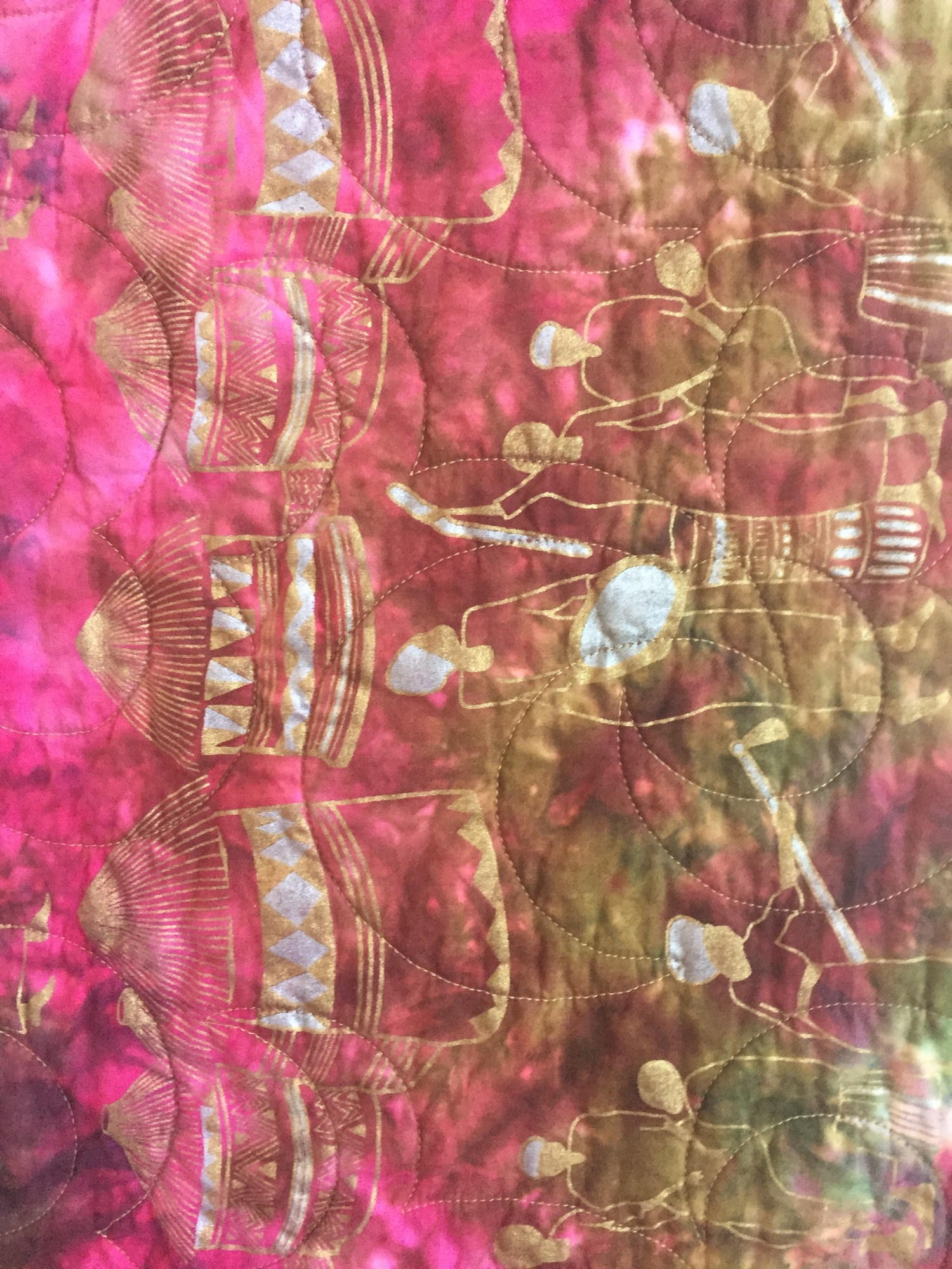 This quilt measures 65x85 inches, so it is big. It is machine pieced and quilted. There is a hanging sleeve in the back because I display all of my quilts sooner or later, but this quilt is definitely big enough to cuddle up under. The fabric on the back is a pink and gold African print.
