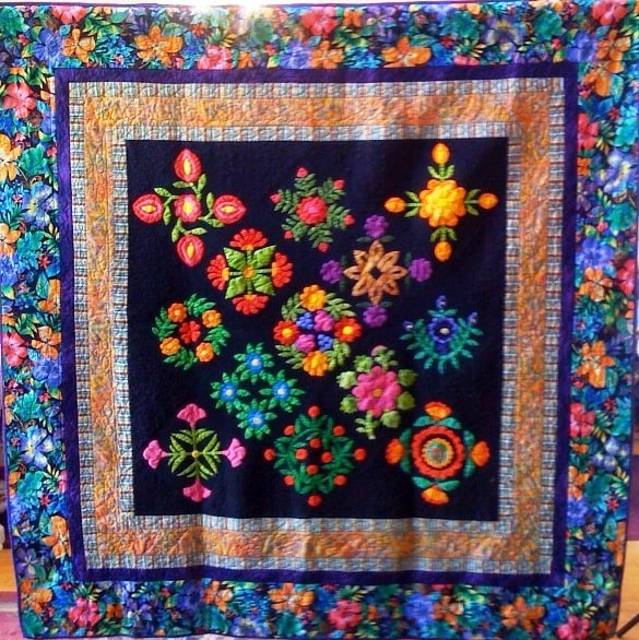 Uncommon Legacy measures 72 x 72 inches. It is appliqued by hand and machine quilted.