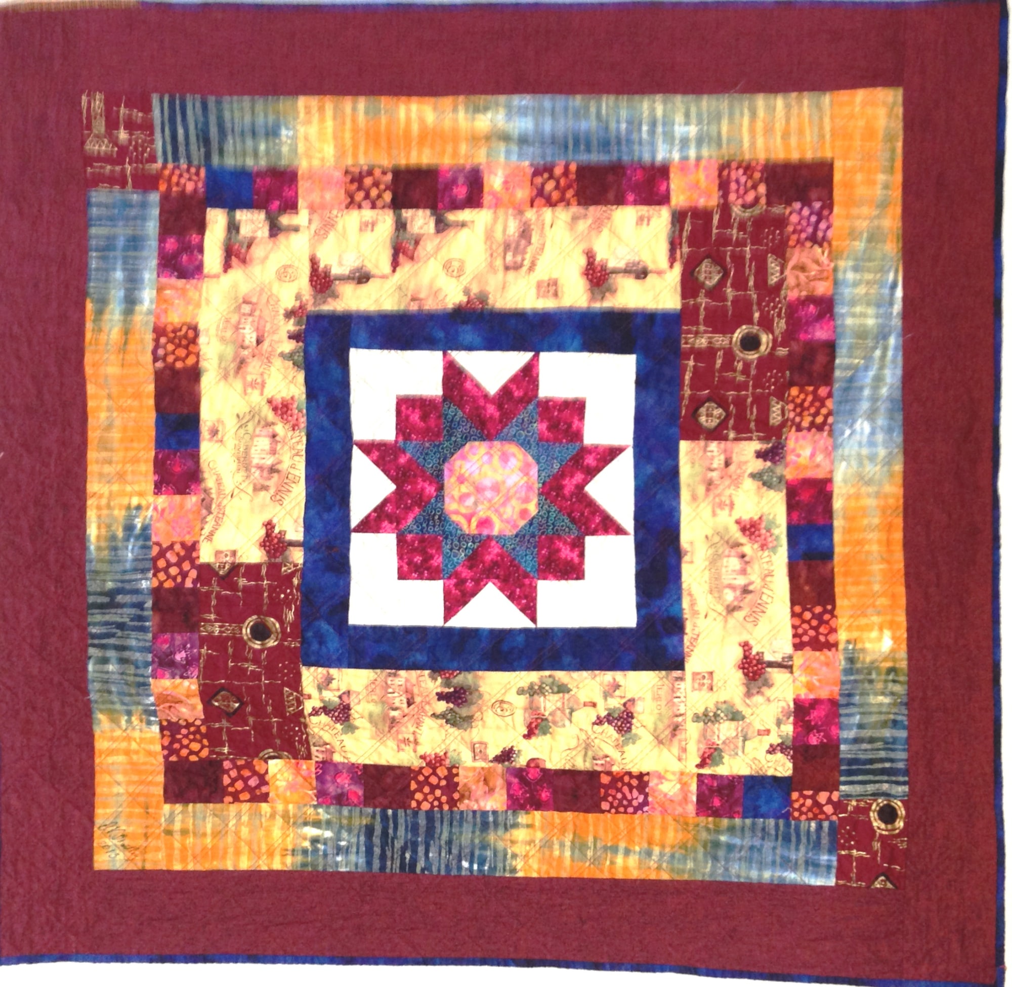 "Vineyard Star at Sunset" is a quilt where old meets new. A traditional star pattern is surrounded by a wine print fabric and authentic African fabric. The quilt measures 42x42 inches. It is machine pieced and machine quilted.