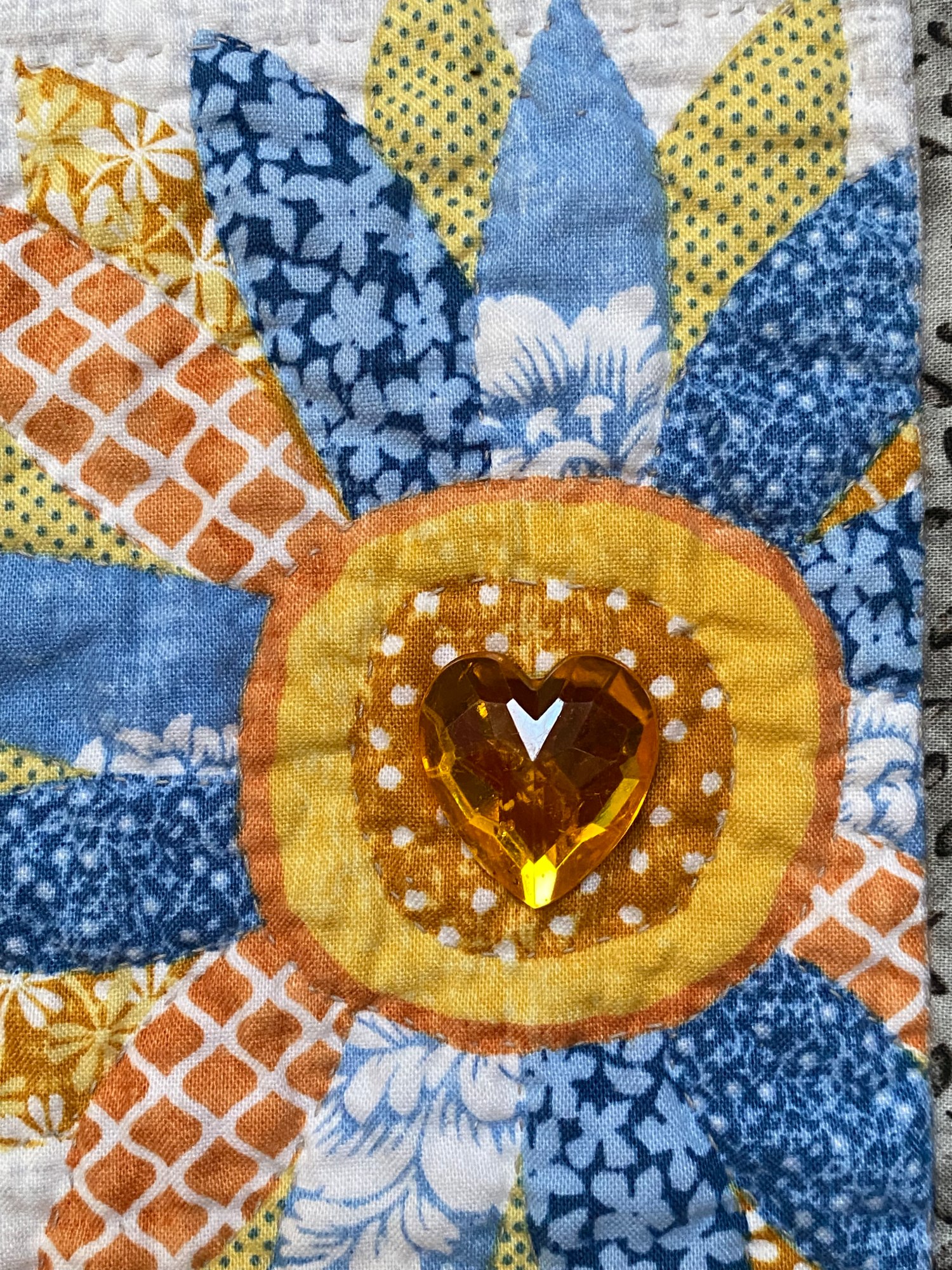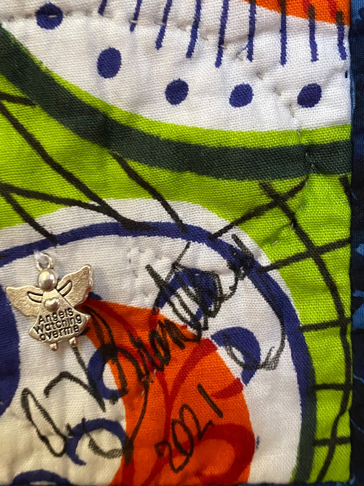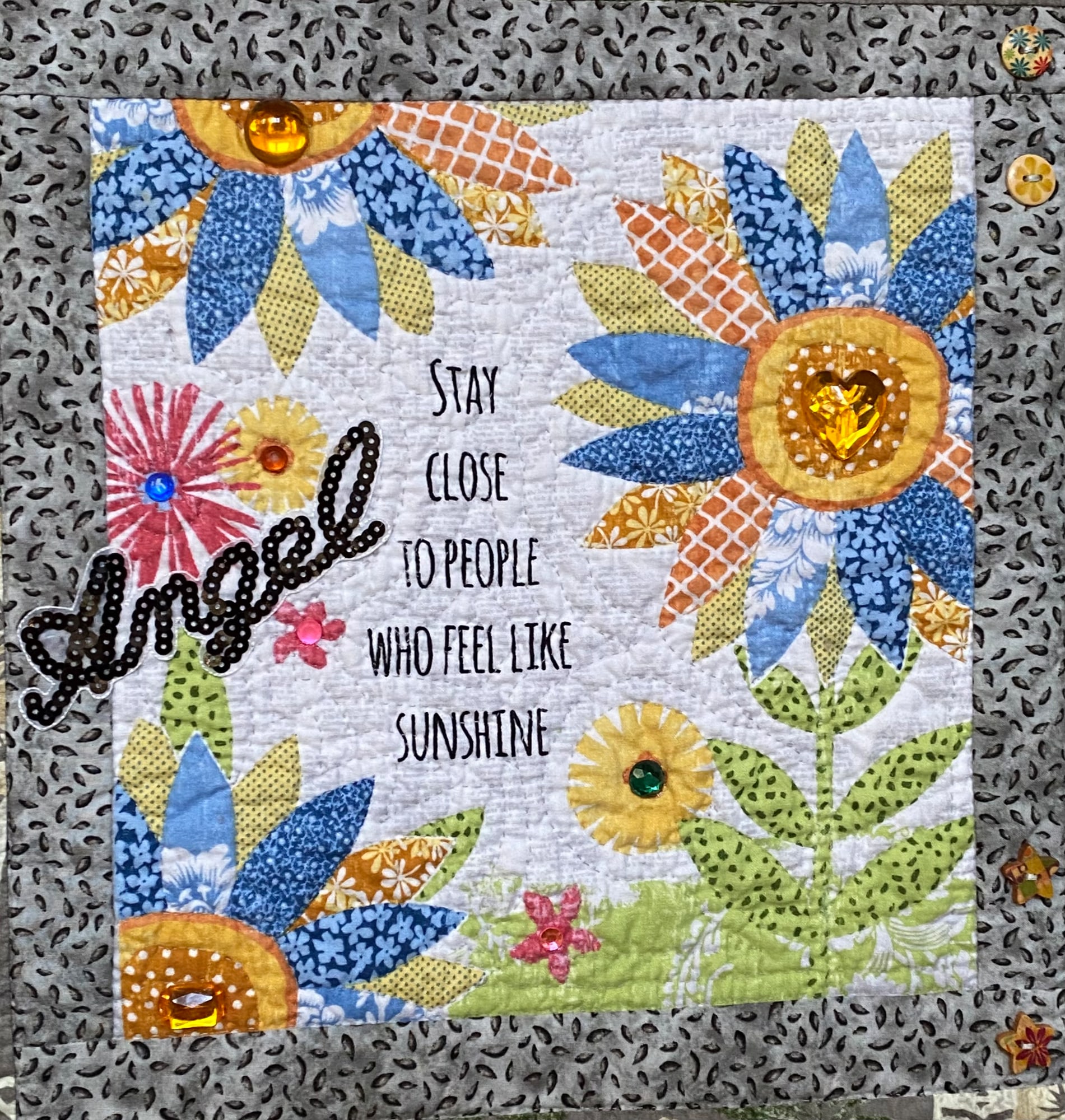 I embellished the quilt with the word angel in black sequins and added an angel charm near my signature. The charm is engraved with the words “Angels watching over me”. I brought the subtle flowers to life by adding buttons and crystals to add dimension.