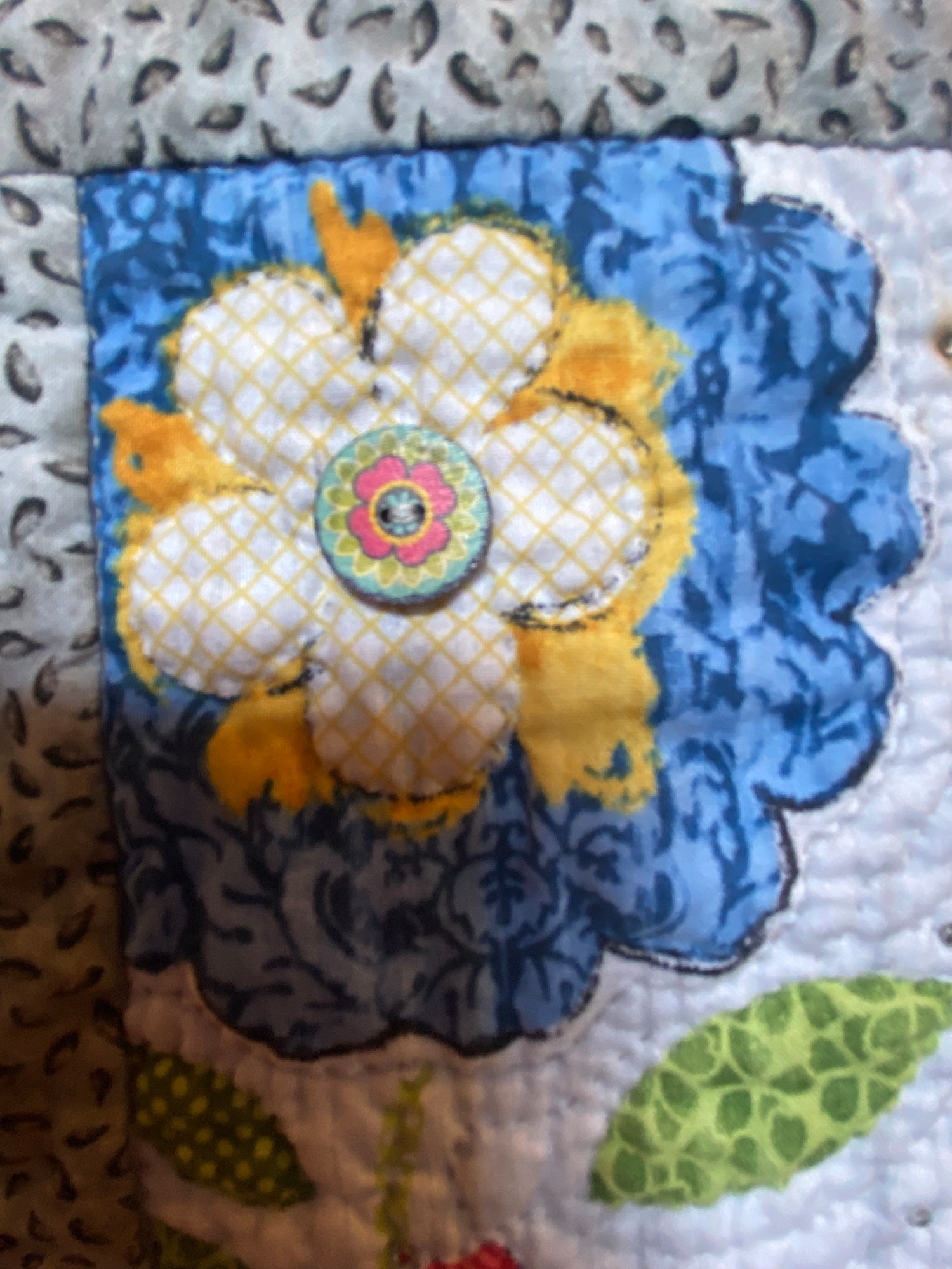 I embellished the quilt with the word angel in black sequins and added an angel charm near my signature. The charm is engraved with the words “Angels watching over me”. I brought the subtle flowers to life by adding painted buttons to add dimension and crystals to catch the light.