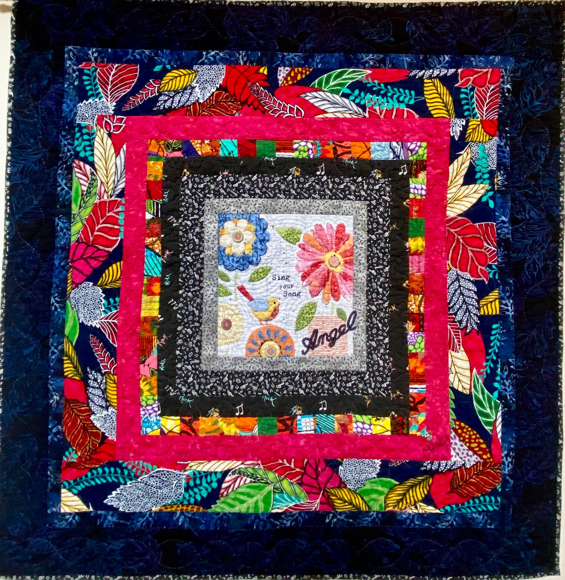 “Whispers From My Angels #8” is the last quilt in the series and measures only 40x 41 inches. The “angel words” say “Sing your song.” I think when my angel whispers those words in my ear, she is telling me to be authentically ,myself. What a great piece of advice!