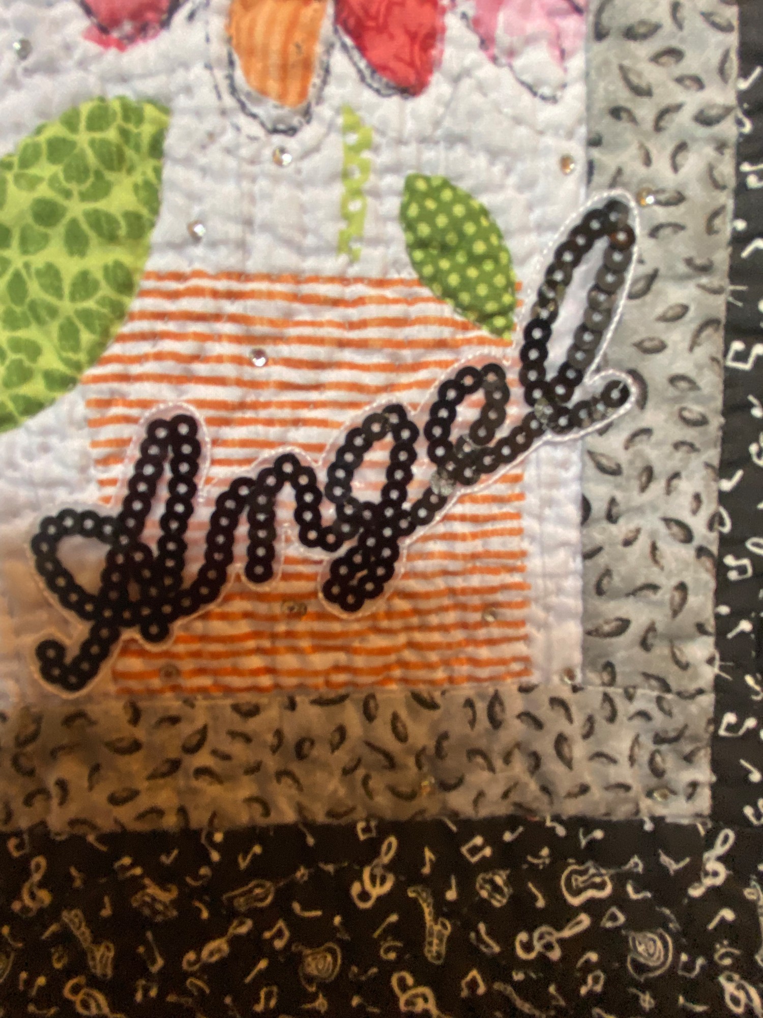 I hand quilted “Whispers From My Angels #8”. I mostly used echo stitching in the center of the quilt but followed stencil quilt patterns in the borders. The binding is the same black and white musical note fabric in the quilt to add cohesion to the composition.