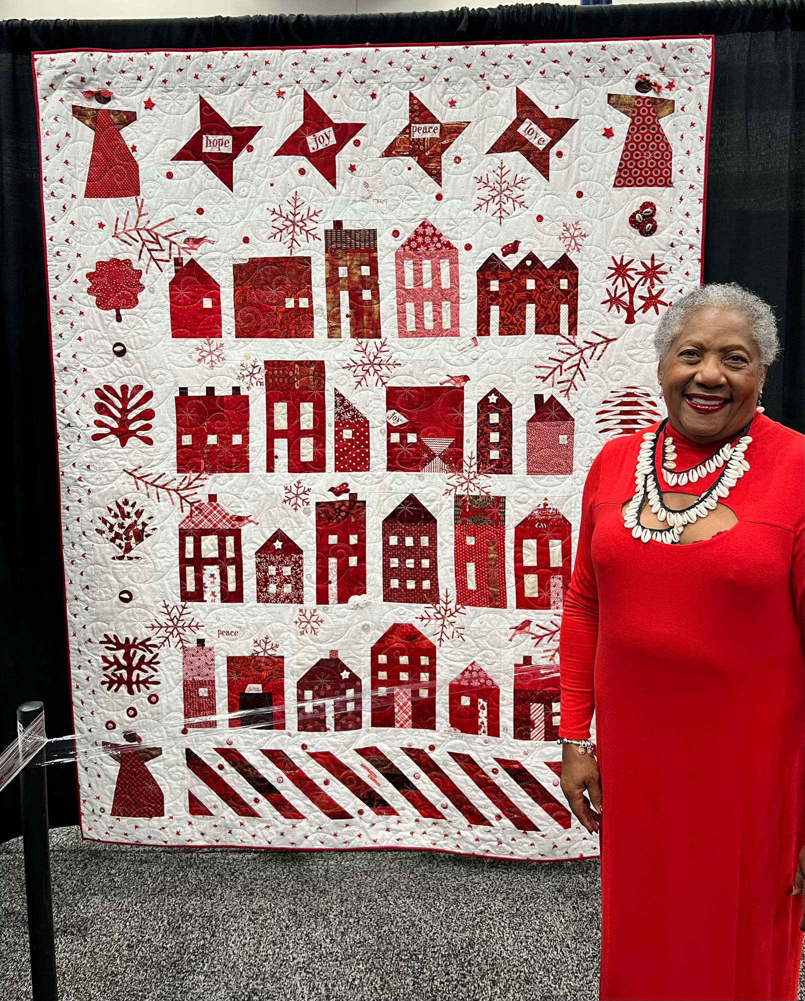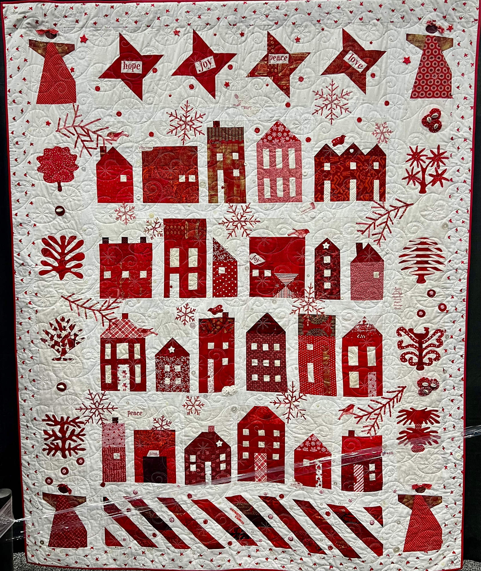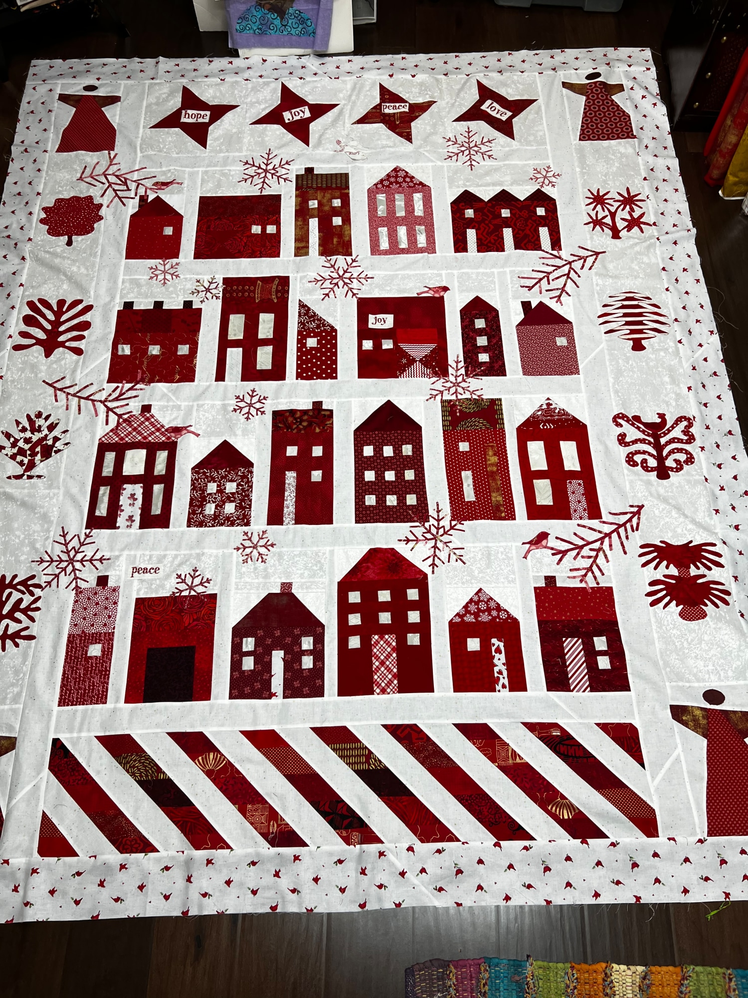 My quilt is inspired by a pattern named “Winter Village” by Laundry Basket quilts. I love house quilts. The houses are only the beginning of my quilt. I added trees designed by Kim McLean, traditional friendship stars with words and peace angels by Kimberly Rado.