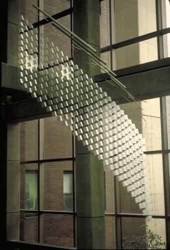''Art Beat'' is a series of eight kinetic units of varying sizes suspended from cable on all levels of the atrium. The surface of the Lexan pieces becomes translucent or reflective depending on light conditions. As the elements turn and curve they produce a slowly changing variety of spatial relationships.