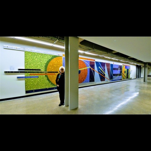 ''Connect,'' is installed in the main lobby of the Washkewicz College of Engineering at Cleveland State University. The artwork draws both an earthbound and metaphoric map anchored around Cleveland state's GPS coordinates, and water imagery flowing through the letter E evokes the natural wonder of lake Erie. The use of Cleveland Steel evokes the history of the city of Cleveland as a steel town and a modern industrial, corporate, and technological powerhouse. The seven monumental letters in the sculpture were designed to incorporate the golden rectangle. Pausing along the 75ft. pathway you can catch a glimpse of reflections in the mirror embedded mosaic. Words of wisdom from artists and scientists are engraved in the tile and patterns formed by glass and steel connect each piece of the mosaic to the next.