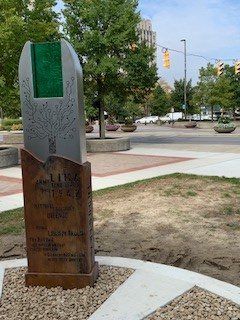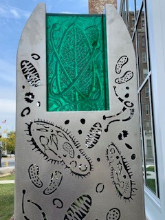 "Cornerstones," consist of three pillars made of stainless steel, Corten steel, and sculpted glass on a limestone and black-stone pebble plaza. The sculpture tells the story of Lima over the past two centuries. It incorporates elements from Lima's industrial, cultural, and architectural history, while recognizing the repositioning of the city with the help of Rhodes State College into a modern hub of health care education and innovation.