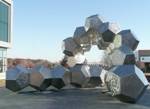 ''Double Helix: Flowing Balance'' is in an outside area. The design is an abstracted reference to the highly important DNA molecular structure. The sculpture is fabricated in stainless steel with a sanded/burnished surface to reflect light. The vertices are one foot and the sculpture is 9' tall by 9' wide by 22' long.