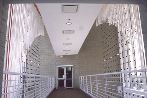 ''Echoes'' was done in collaboration with Alice Van Leunen and is suspended on two sides of the sky bridge. Each half of the sculpture consists of an arcing wedge of acrylic tubes with dichroic glass inserts and a rectangular grid of spheres. The artwork spans an area of approximately 40 feet by 20 feet.