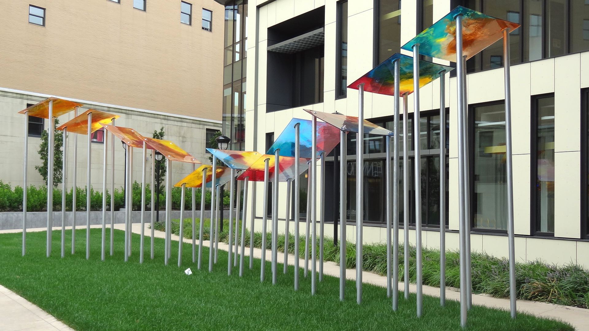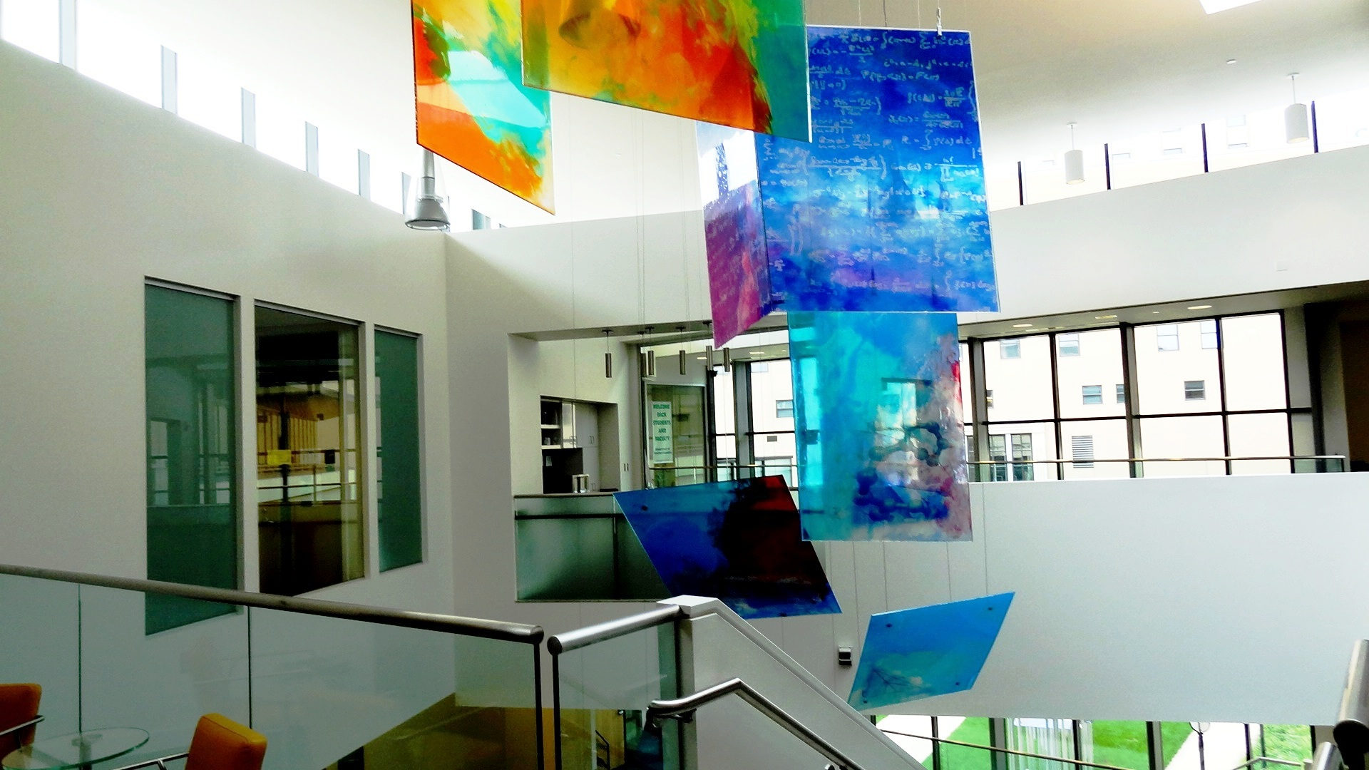 ''Knowledge: Language and Unfolding'' is a two-part site-specific work exploring the themes of knowledge, innovation, experimentation, idea generation and discovery in education. Work one is sited as a suspended sculpture in the central atrium space. Comprised of 24 book shape panels approximately 5 x 4 ft and /34 inch thick. Work two is sited in the outdoor courtyard visible from the lobby and mezzanine. There are 17 books and pages shaped panels supported by stainless-steel free-standing poles.