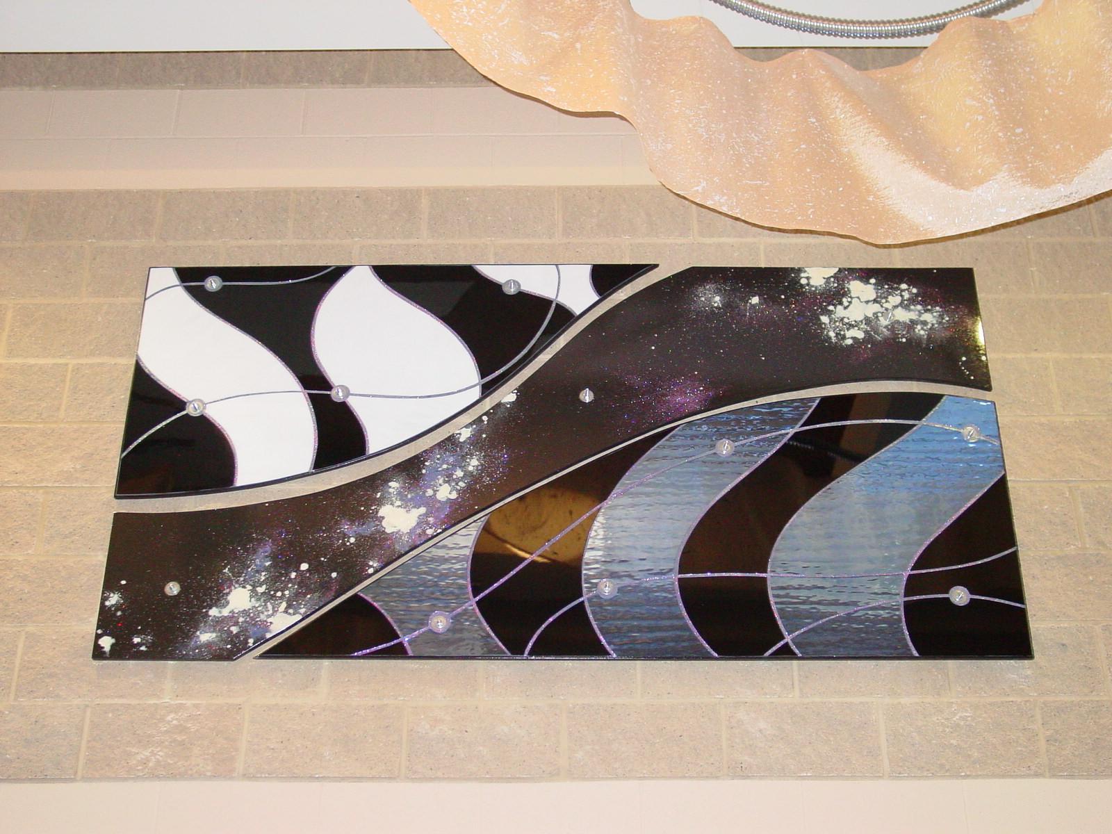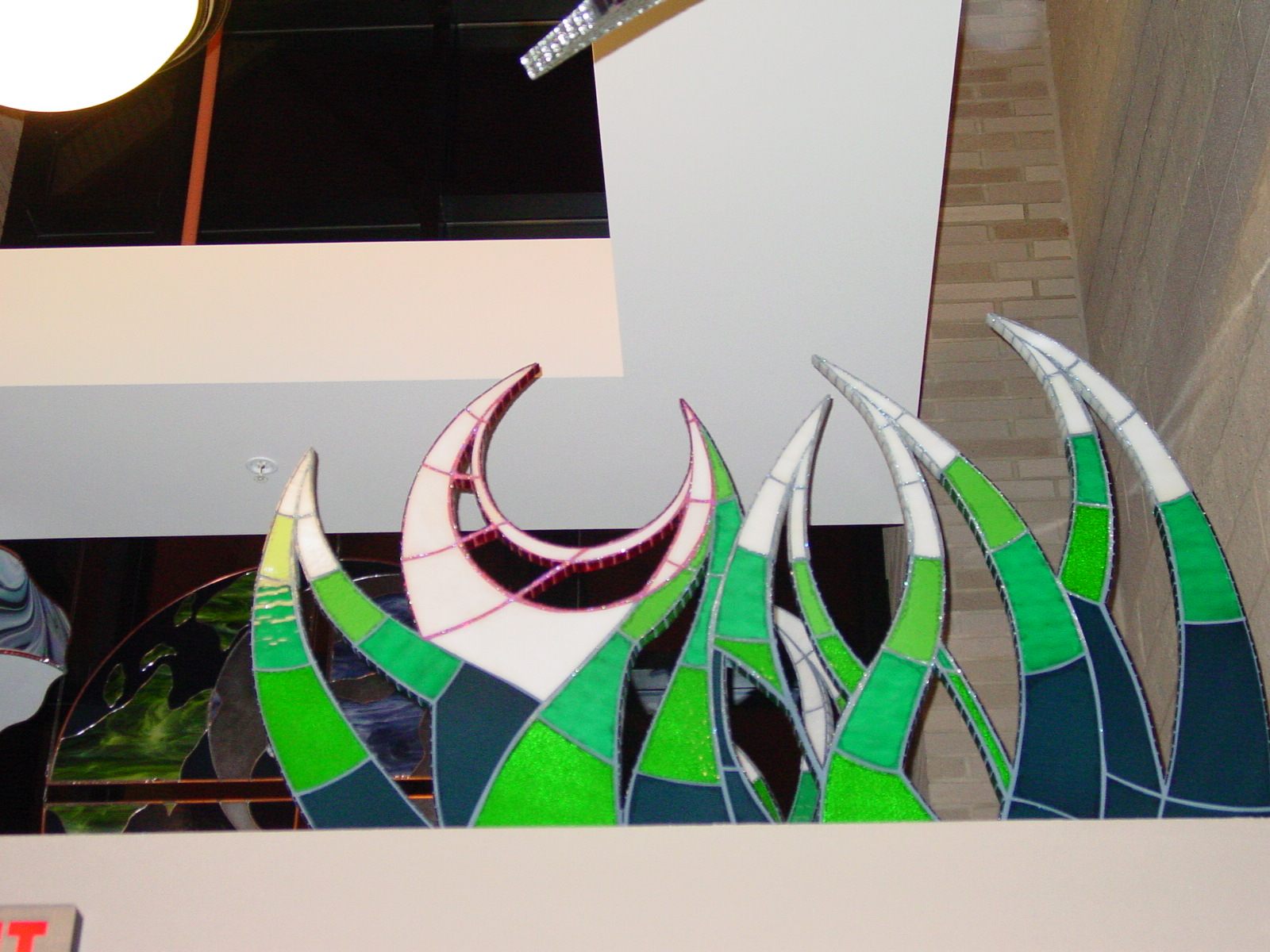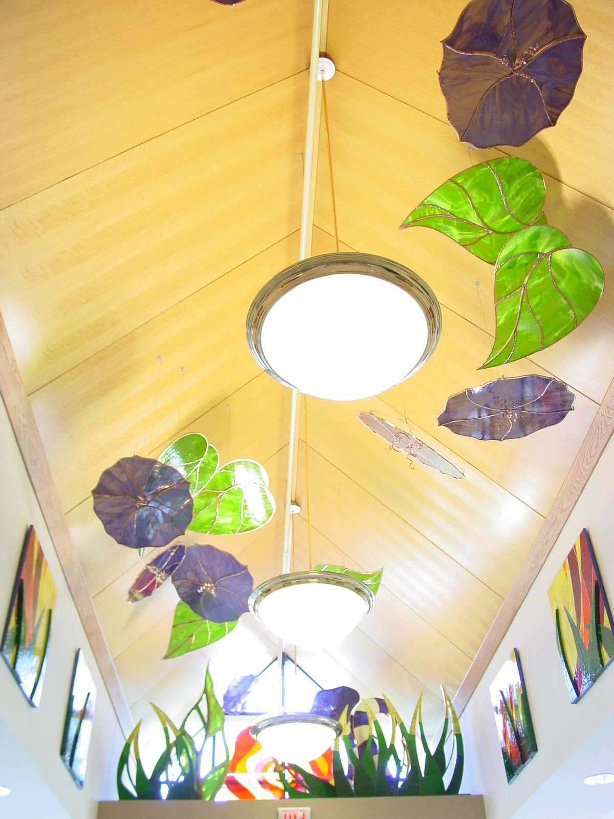 ''One Garden'' is a permanent glass art installation in three building areas. In the Social Center is a glass sun element, a standing leaf and two Morning Glory pods in front of windows. On a soffit are eight glass wall mosaics, eight glass leaves and seven glass Morning Glory flowers. Outside in the pavilion is a glass leaf, a Morning Glory flower and three moon dust elements. By the gym is a moon element and an earth element in front of windows. Above the vestibule are six glass mosaics depicting grass and two Moonflower pods. There are six glass wall mosaics and in the ceiling are eight Moonflowers, three shooting stars and a moon dust path.