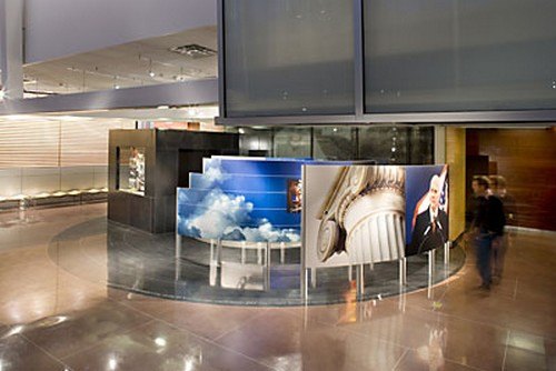 ''Point of View'' is an installation on the long black terrazzo wall that extends ten feet outside. The installation is carved, etched and engraved with images that relate in an abstract way to the flight path of John Glenn's Mercury flight. The idea for the art came from the perspective of the thoughts that could have been going through John Glenn's mind when he was in space.