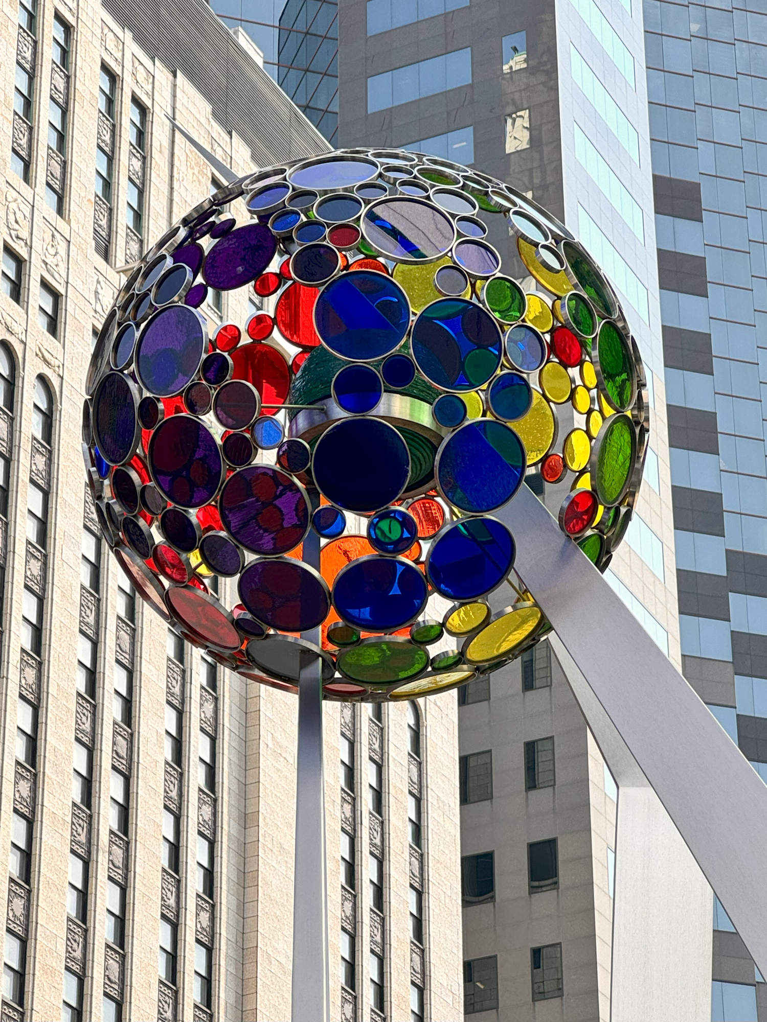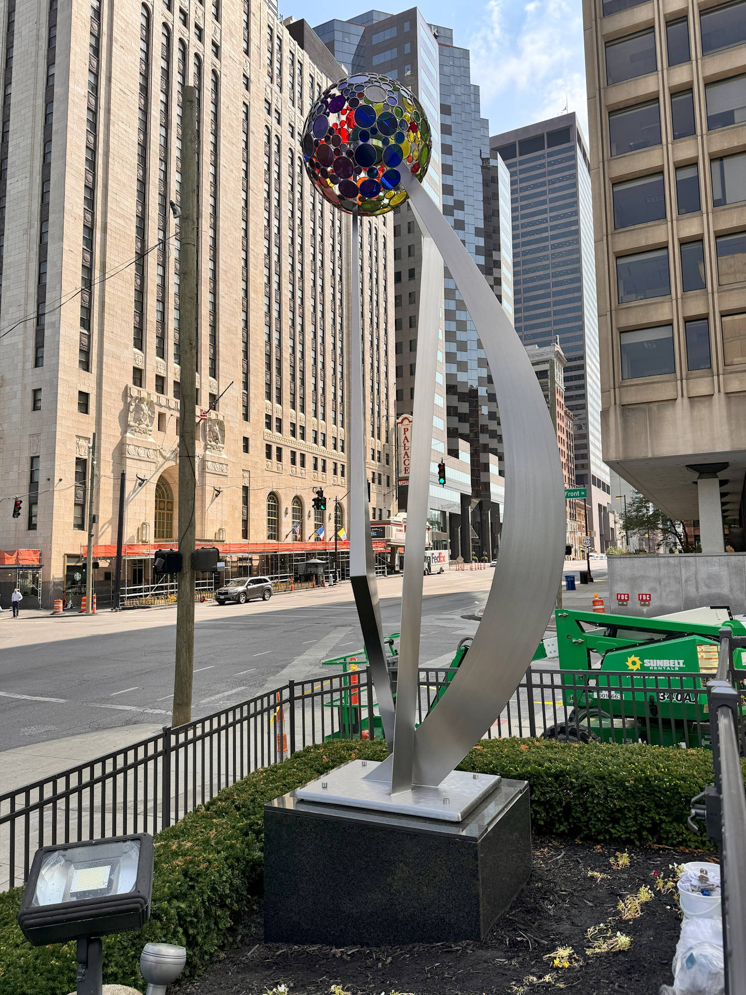 ''Quest'', a monumental stainless-steel sculpture, sits on a marble base. It is topped with an orb of laminated glass that is open and lacy.
