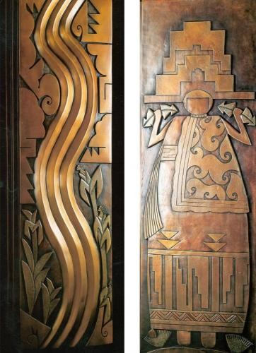 ''Rains for the Harvest'' is a large bronze relief sculpture from a limited edition of eight. The imagery depicted is a representation of how the physical world of the Pueblo people is tied to the spiritual world. One side is adorned with some elements of nature, such as corn and rain. The other side depicts a woman in ceremonial vesture prepared to participate in the corn dance. On the short sides of the piece is a stepped relief which represents steps to and from the kiva.
