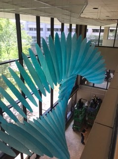 The work is inspired by the form of the double helix, the molecular shape of a double-stranded DNA molecule and is a representation of the intersection of biology and chemistry. Suspended from the ceiling in the atrium space, the work is translucent and compelling, while creating a sense of movement and energy.