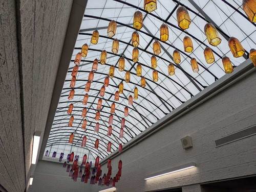 "Rising Sun," is made of metal and-blown glass in a transitional color scheme from golden light to deep amethyst
