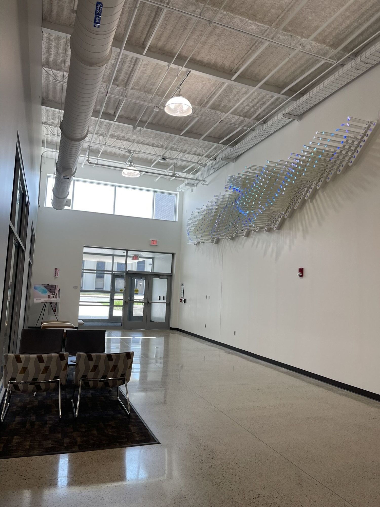 ''Site and Scope'' is an extended pixel map, made of cut and hand polished clear glass rods and CNC cut mirrored glass panels that reflect the complex topographical relief. The overall shape is an abstracted Gantt chart, to maximize the available structural wall and bring the eye down from the exposed mechanical and electrical elements above the student-centric space. For both the rod and cut forms, we will design and make custom wall mounts and fittings with the aid of 3D printing, CNC machining, and traditional processes. In this hybrid methodology, the form and techniques we will use relate to contemporary approaches to building, highlighting constructs of architecture and construction.