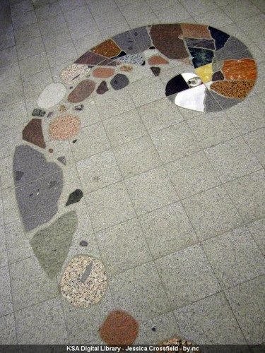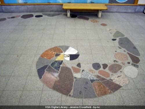 The artwork includes a stone wall, a floor with spiral banners of inlaid stone and a series of Geology Panels combining aesthetic designs with informational samples of stones and minerals.
