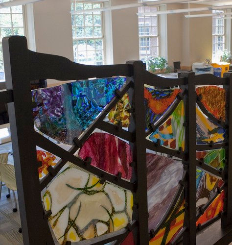 ''The Screen of Afflatus'' is made of two screens that are designed to inspire students and faculty alike in the creative process not only of art but also of learning, feeling and observing. The glass and wood screens with bold lines and bold colors are a combination of vibrant developing forms that replicate sunlight, earth, water and all fundamental forces that have created and continue to create life as we know it on earth in all its manifestations. The pieces will exhibit a powerful interplay of color and form that integrate the four stated disciplines through the use of symbols, words, objects and materials that will give life to the space. Symbolic glass tile pieces attached to the columns reflect the evolving attachment of man to science, knowledge, research and the preservation of our accumulated humanity. The overall concept is to create an impression of intense color, shapes, light and materials that draws the eye and the imagination to these objects. Just as a library is a place of study and reflection this work is comparable to a beautiful book that is inviting by its title and name of the author but holds the magical secrets deeper within its pages.