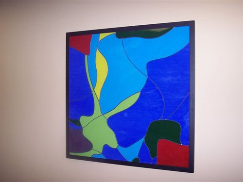 Nine leaded stained glass windows that are inspired by the colorful imagery found in CT scans of the brain. The two 52''x54'' square windows have a coordinating design. Additionally a 60''x60'' wall sculpture made of stained opalescent glass, located elsewhere in the building, compliments the window imagery.