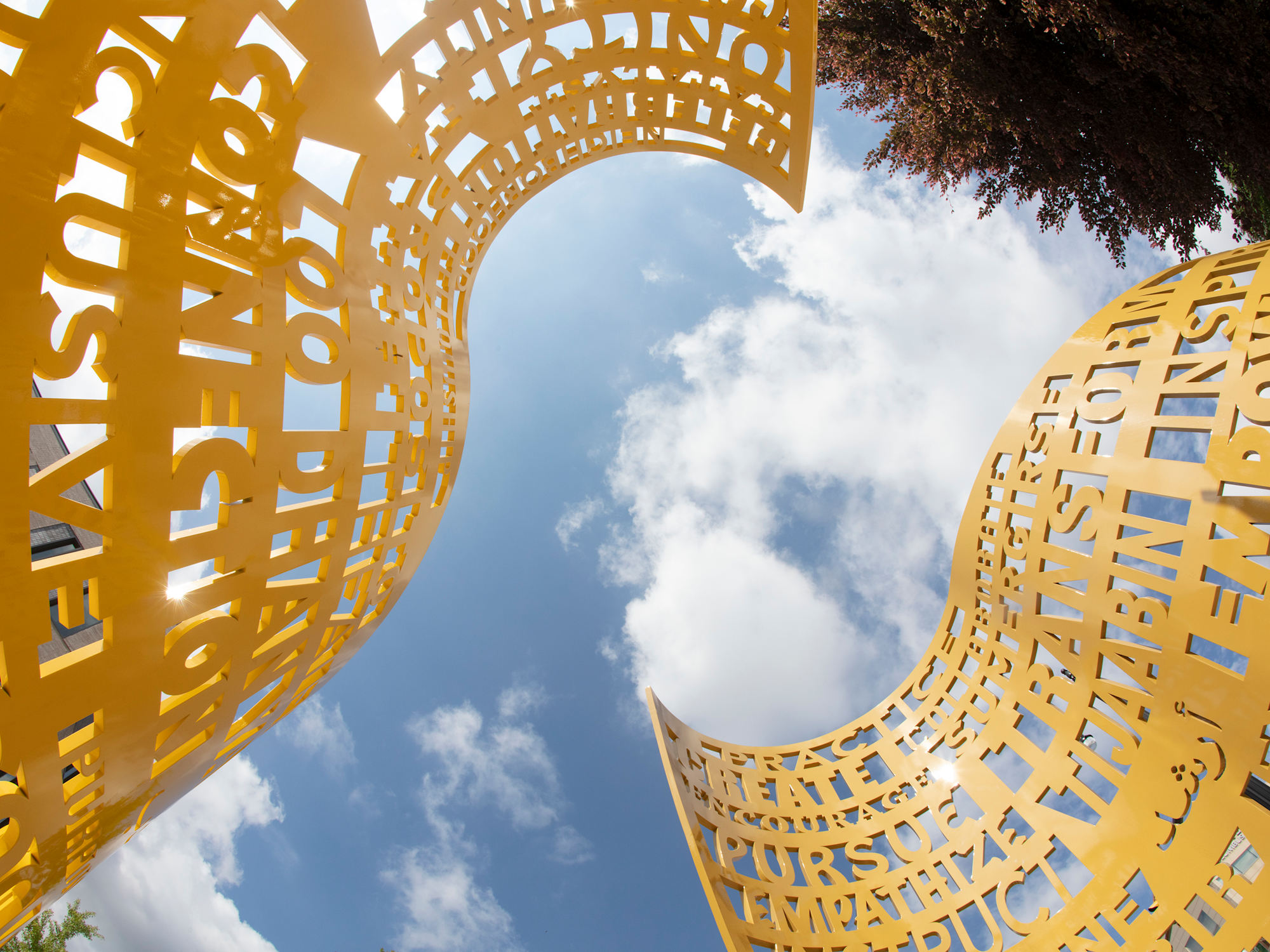 ''Vortex'' seeks to make an Identifiable marker between the campus and the neighborhood. Its curling motion invites pedestrians in to experience the artwork, while its active surface and warm colors are a visible and pleasant presence for the passersby.