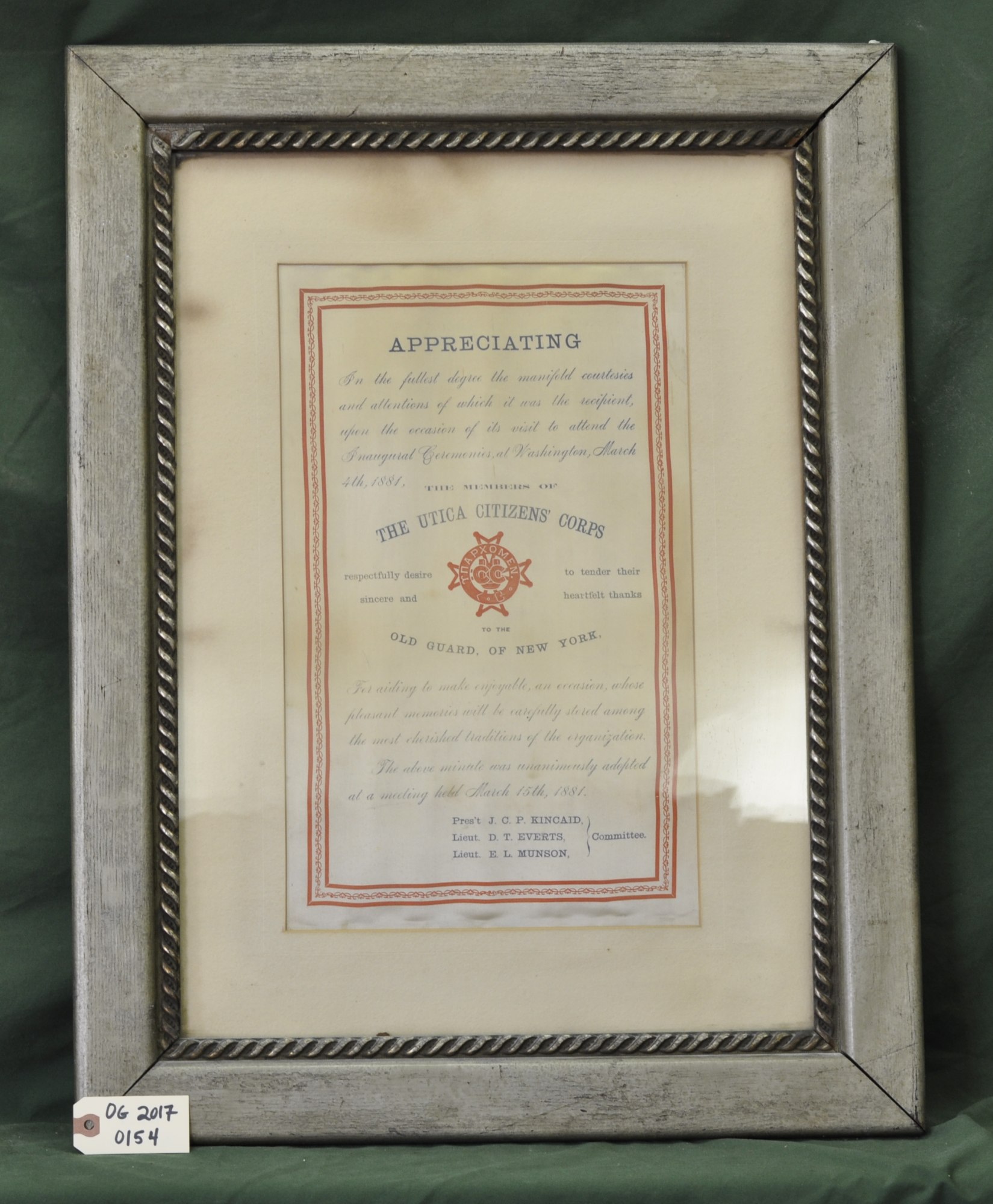 - Certificate of Appreciation from The Utica Citizens' Corps to the Old Guard of New York
