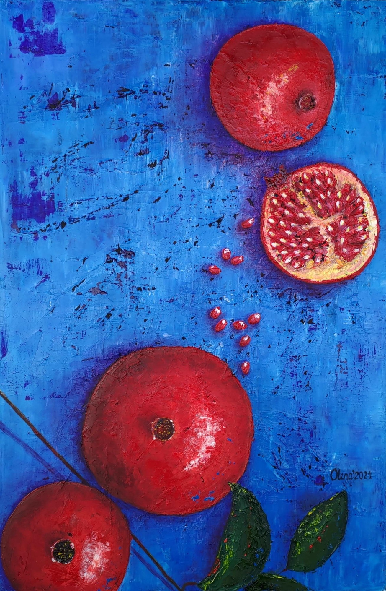 The Pomegranades series is an artistic series inspired by the double meaning of the word "pomegranate" in Ukrainian and in French– the fruit symbolizing prosperity, life force, and rebirth, and a weapon of war. This series invites us to choose the fruit over the bomb.
