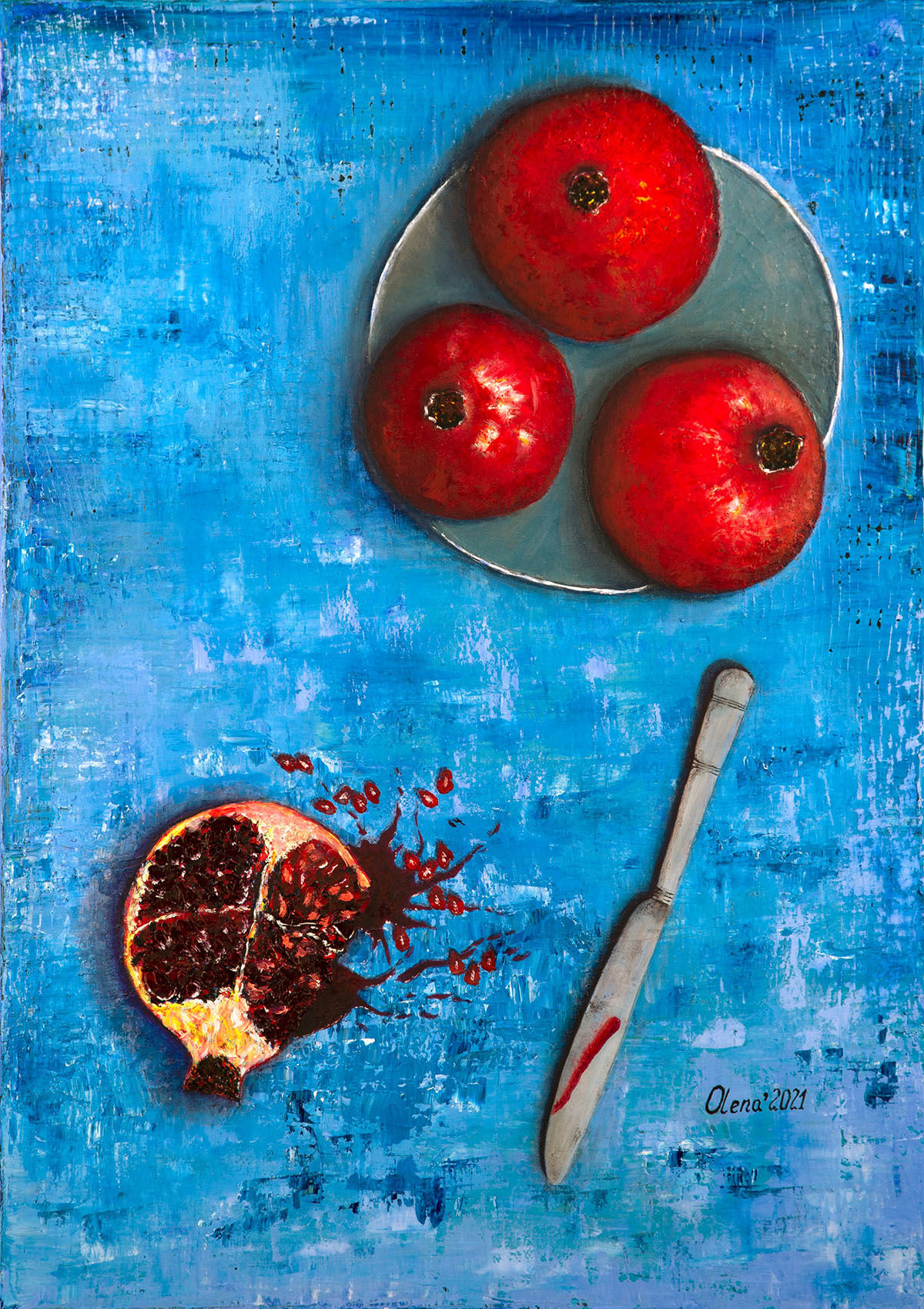The Pomegranades series is an artistic series inspired by the double meaning of the word "pomegranate" in Ukrainian and in French– the fruit symbolizing prosperity, life force, and rebirth, and a weapon of war. This series invites us to choose the fruit over the bomb.