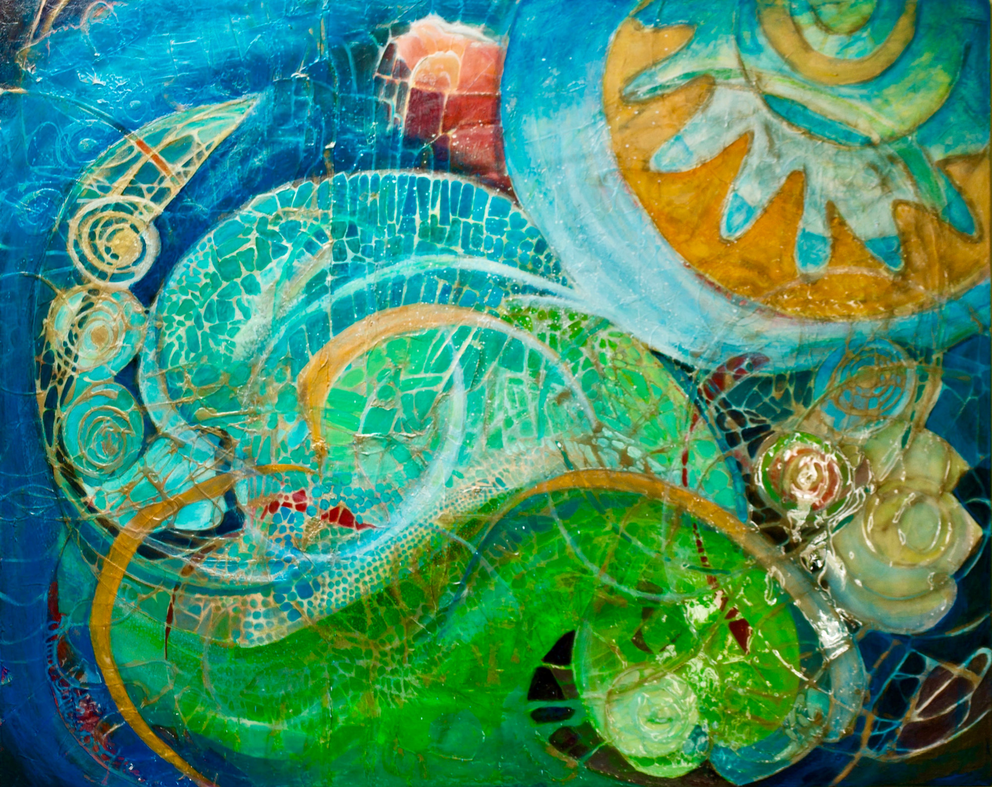 This richly textured painting can hang horizontal or vertical. It is an abstraction which captures the feeling of warm shimmering water, and glimps of underwater life from the eyes of the artist, who is an avid advanced certified scuba diver.