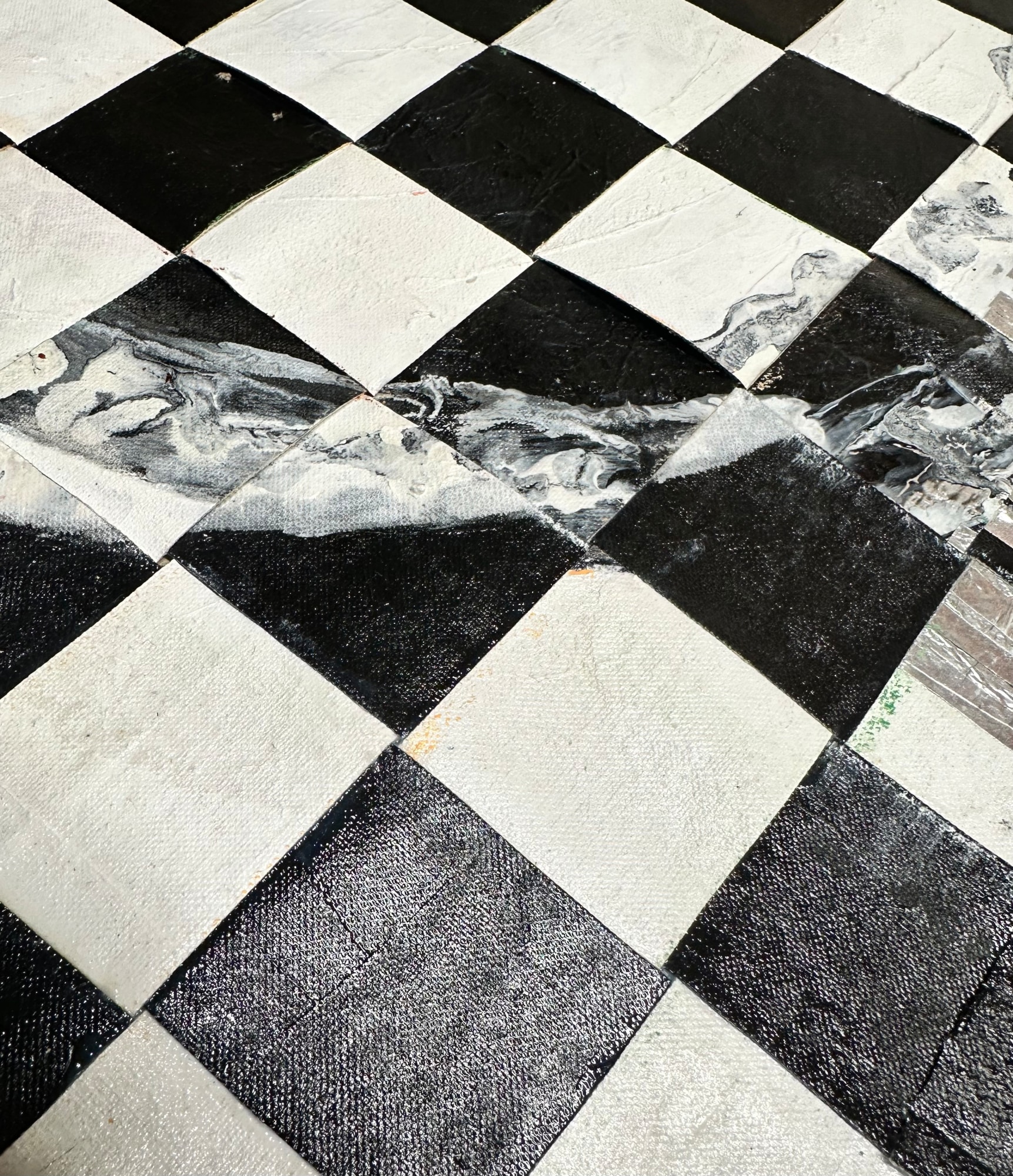 This monochromatic painting has been created using interwoven strips of canvas. It is about how our relationships are intertwined as we tend to move in familiar circles.