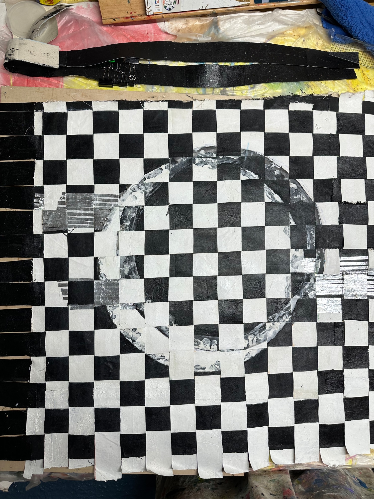This monochromatic painting has been created using interwoven strips of canvas. It is about how our relationships are intertwined as we tend to move in familiar circles.